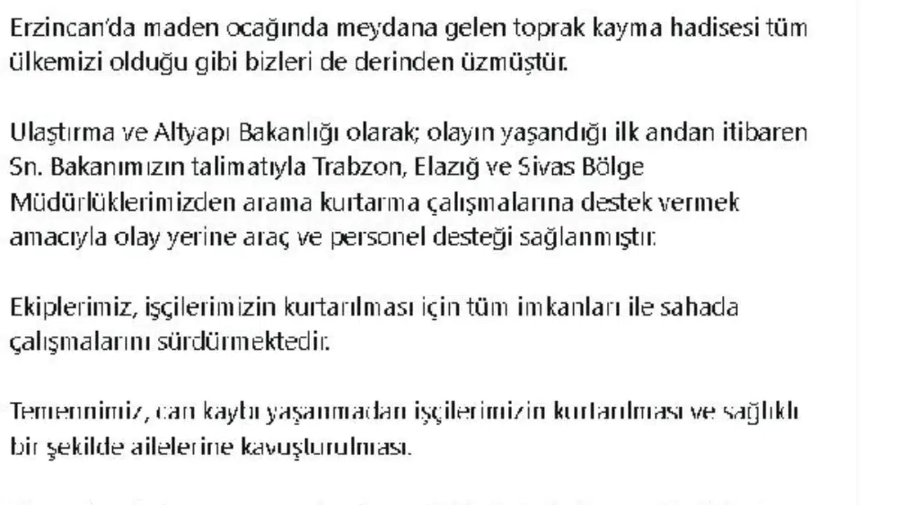 Ulaştırma ve Altyapı Bakanlığı'ndan yapılan açıklamada, Erzincan'ın İliç ilçesinde maden ocağında meydana gelen toprak kayması ile ilgili bölgeye araç-gereç ve personel desteği sağlandığı belirtildi. Açıklamada, "Erzincan'da maden ocağında meydana gelen toprak kayma hadisesi tüm ülkemizi olduğu gibi bizleri de derinden üzmüştür. Ulaştırma ve Altyapı Bakanlığı olarak; olayın yaşandığı ilk andan itibaren Sayın Bakanımızın talimatıyla Trabzon, Elazığ ve Sivas Bölge Müdürlüklerimizden arama-kurtarma çalışmalarına destek vermek amacıyla olay yerine araç ve personel desteği sağlanmıştır. Ekiplerimiz, işçilerimizin kurtarılması için tüm imkanları ile sahada çalışmalarını sürdürmektedir. Temennimiz, can kaybı yaşanmadan işçilerimizin kurtarılması ve sağlıklı bir şekilde ailelerine kavuşturulması. Tüm vatandaşlarımıza geçmiş olsun dileklerimizi iletiyoruz. Rabbim her türlü kaza ve afetten milletimizi korusun." ifadelerine yer verildi.
