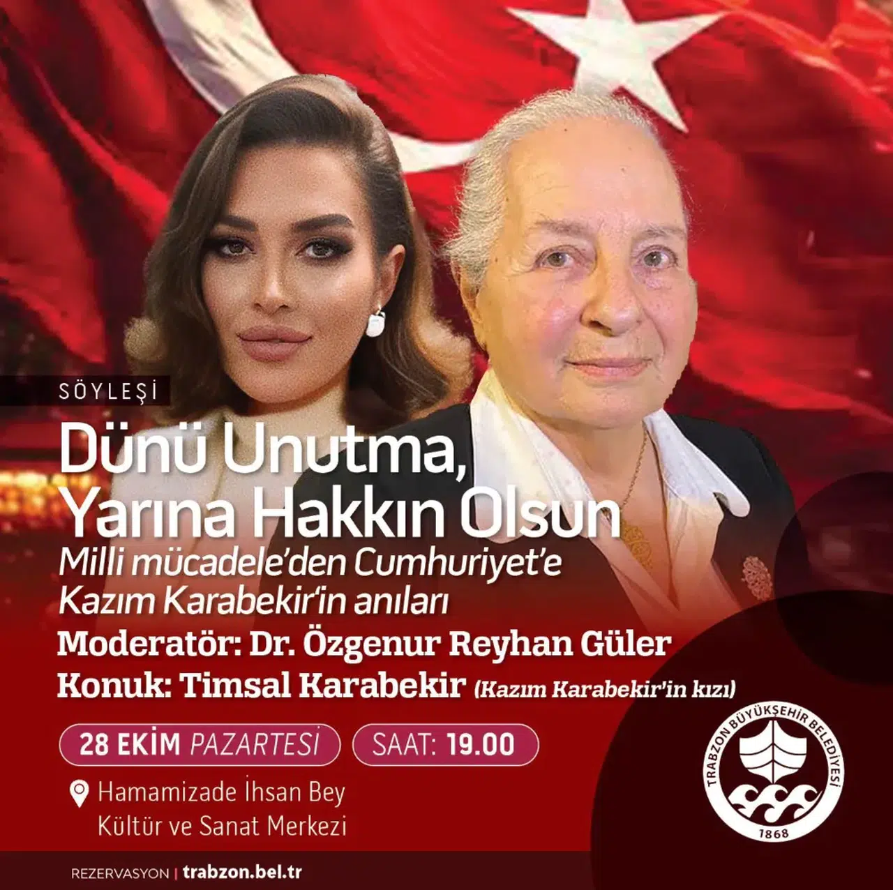 Trabzon Büyükşehir Belediyesi, Cumhuriyet'in kuruluşuna giden yolda önemli bir isim olan Kazım Karabekir Paşa'nın hatıralarını gün yüzüne çıkaracak anlamlı bir etkinliğe imza atıyor. "Dünü Unutma, Yarına Hakkın Olsun" başlıklı söyleşi, 28 Ekim Pazartesi akşamı saat 19.00'da Hamamizade İhsan Bey Kültür Merkezi'nde gerçekleştirilecek.