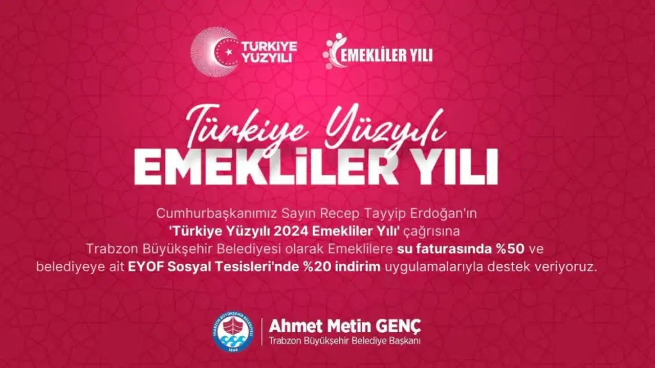 Trabzon Büyükşehir Belediye Başkanı Ahmet Metin Genç, Cumhurbaşkanı Recep Tayyip Erdoğan'ın "Türkiye Yüzyılı 2024 Emekliler Yılı" kapsamında başlattığı destek programına önemli katkılarda bulunduklarını duyurdu. Emeklilere yönelik çeşitli indirimler sunan Trabzon Büyükşehir Belediyesi, su faturalarında %50, EYOF Sosyal Tesisleri'nde ise %20 indirim sağlayarak emeklilerin yüzünü güldürüyor.