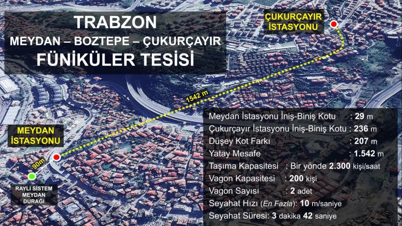 Trabzon'da hayata geçirilecek Meydan-Çukurçayır Füniküler Hattı Projesi tanıtıldı. 2 yıl içinde tamamlanması planlanan ve 1.542 metre uzunluğundaki hat, 3 dakika 42 saniyede ulaşım sağlayarak şehir içi trafik yükünü hafifletecek.