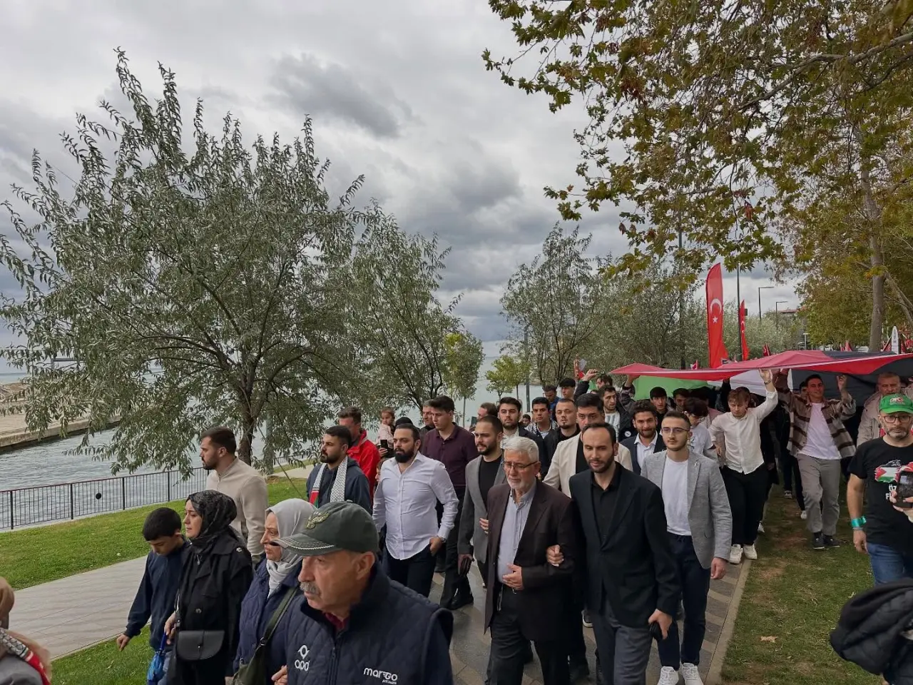 Katılımcılar yürüyüş boyunca, Filistin halkının yanında olduklarını ve adalet mücadelesine destek verdiklerini vurguladı. Ellerinde pankartlar ve dövizler taşıyan vatandaşlar, sokaklarda güçlü bir ses çıkararak zulme karşı duruşlarını gösterdi.