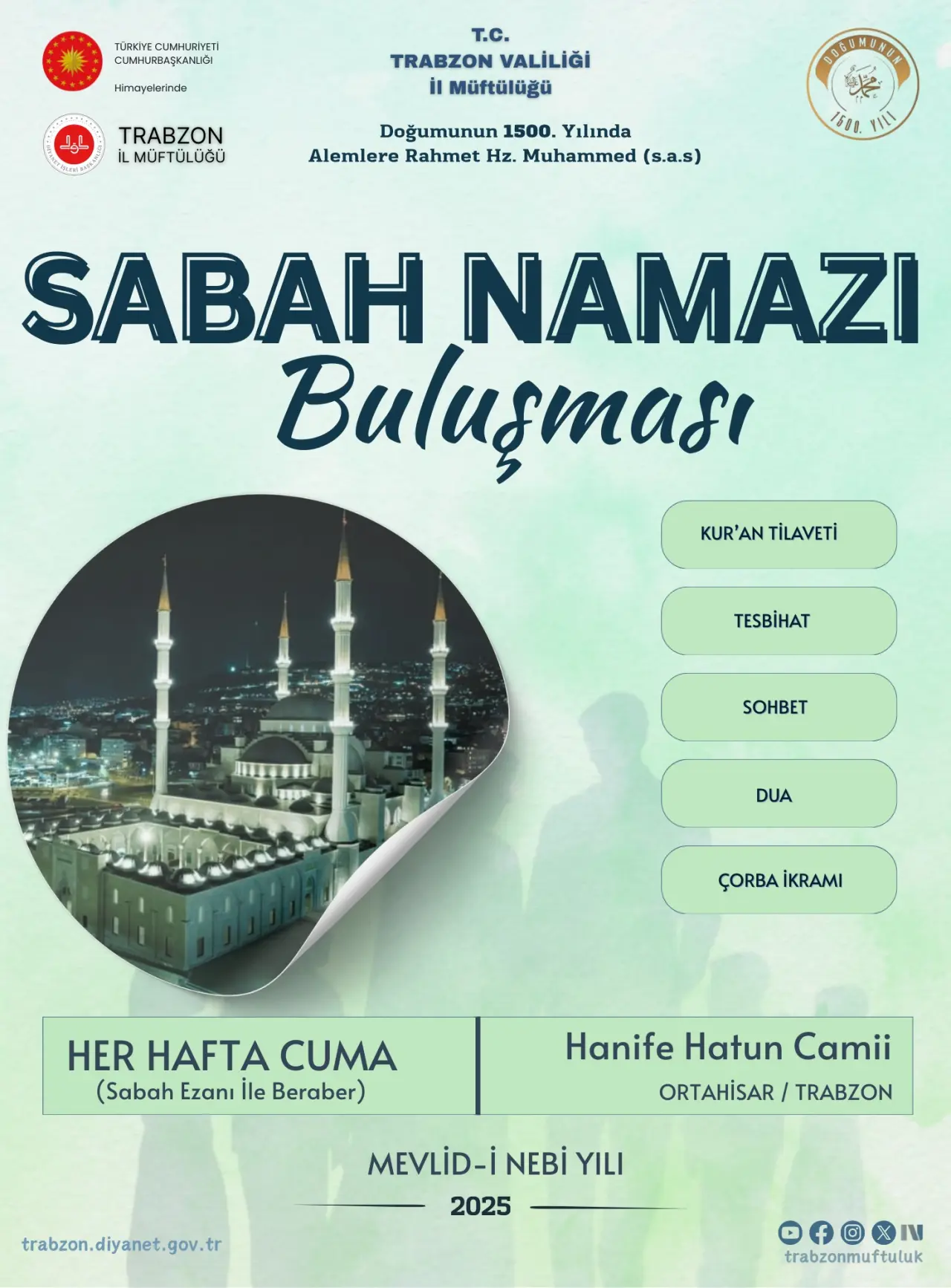 Trabzon İl Müftülüğü tarafından sosyal medya hesaplarından yapılan paylaşımda, her Cuma sabahı Hanife Hatun Camii’nde düzenlenen Sabah Namazı Buluşması vatandaşlarla buluşuyor. Sabah ezanıyla başlayan program, katılımcılara huzurlu ve anlamlı bir güne başlama fırsatı sunuyor.