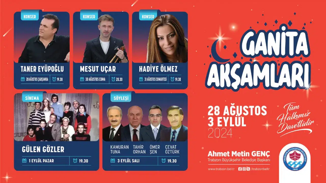 Trabzon Büyükşehir Belediyesi'nin düzenlediği ve şehrin kültürel yaşamına canlılık katan Ganita Akşamları, bu yıl da dolu dolu programlarla devam ediyor. Karadeniz'in sevilen sanatçıları Taner Eyüpoğlu, Mesut Uçar ve Hadiye Ölmez’in sahne alacağı etkinliklerde, müzikseverler unutulmaz anlar yaşayacak. Bunun yanı sıra, söyleşi programları ve sinema gösterimleri ile Trabzon halkı kültür dolu günler geçirecek.