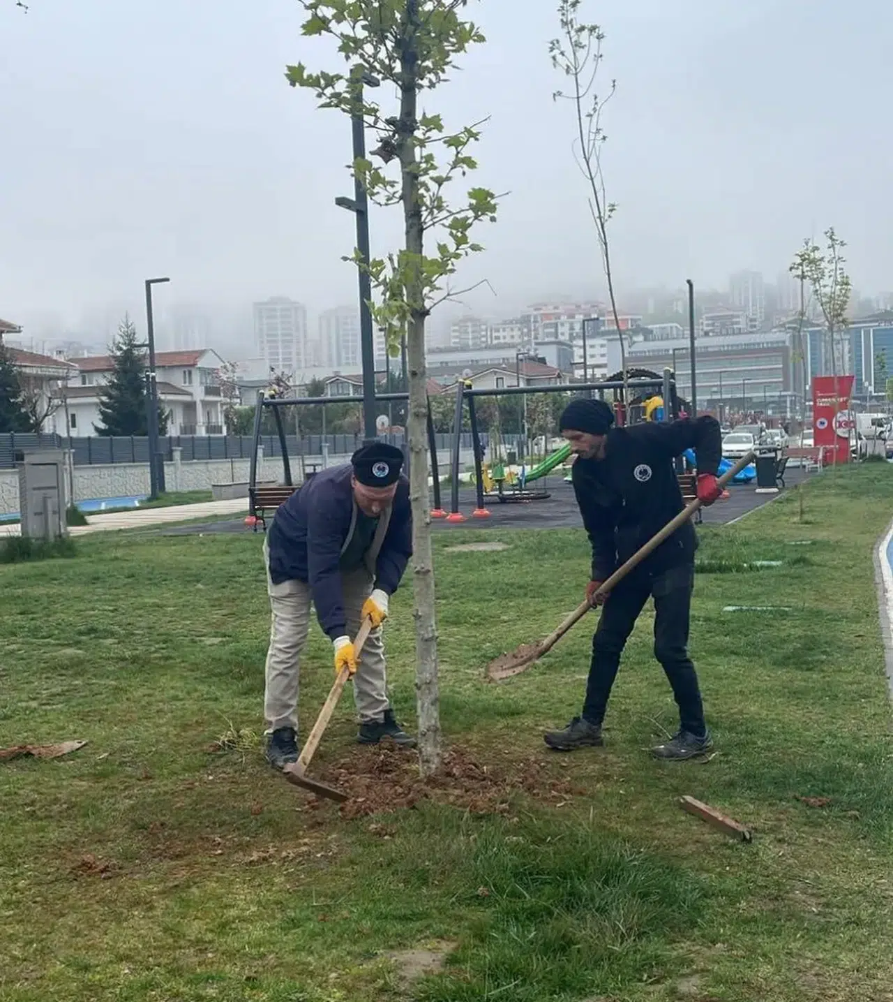 Cumhuriyet Parkı’nda kuruyan ağaçlar sökülerek yerine çevre dostu çınar ağaçları dikildi.
