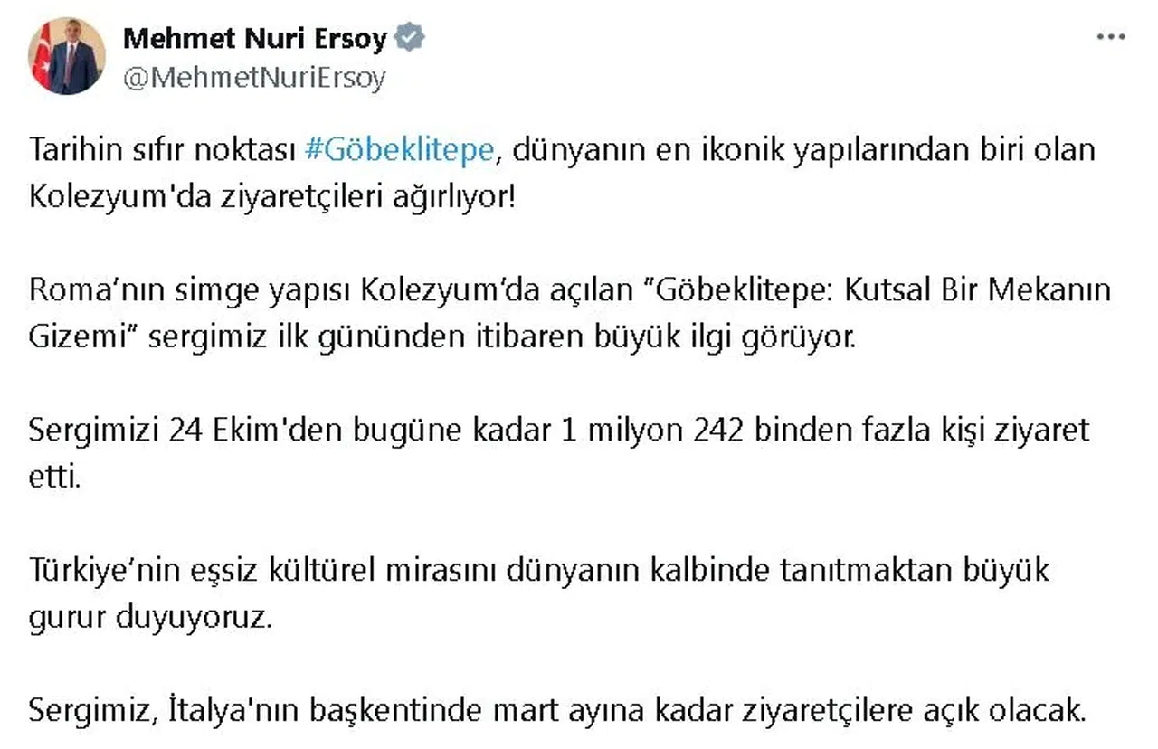 Bakan Mehmet Nuri Ersoy, sosyal medya hesabından yaptığı açıklamada, "Tarihin sıfır noktası Göbeklitepe, dünyanın en ikonik yapılarından biri olan Kolezyum'da ziyaretçileri ağırlıyor. Roma'nın simge yapısı Kolezyum'da açılan 'Göbeklitepe: Kutsal Bir Mekanın Gizemi' sergimiz ilk gününden itibaren büyük ilgi görüyor. Sergimizi 24 Ekim'den bugüne kadar 1 milyon 242 binden fazla kişi ziyaret etti. Türkiye'nin eşsiz kültürel mirasını dünyanın kalbinde tanıtmaktan büyük gurur duyuyoruz. Sergimiz, İtalya'nın başkentinde mart ayına kadar ziyaretçilere açık olacak" ifadelerini kullandı. (DHA)