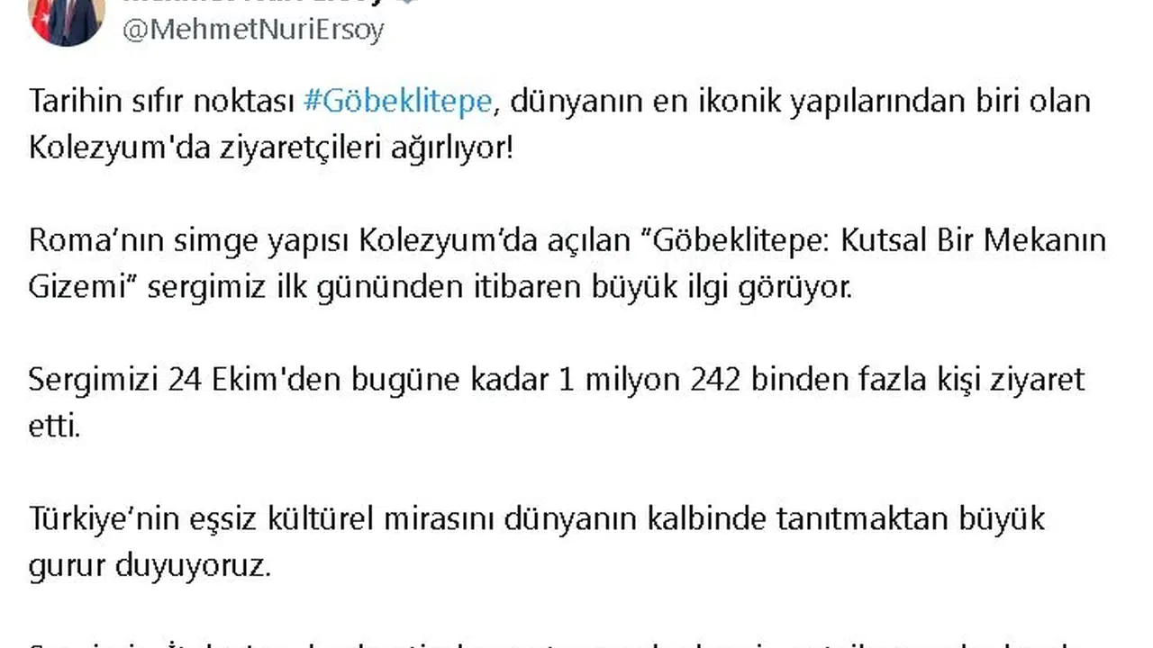ANKARA, (DHA)- KÜLTÜR ve Turizm Bakanı Mehmet Nuri Ersoy, Roma'nın simge yapısı Kolezyum'da açılan 'Göbeklitepe: Kutsal Bir Mekanın Gizemi' sergisinin ilgi odağı olduğunu açıkladı.
