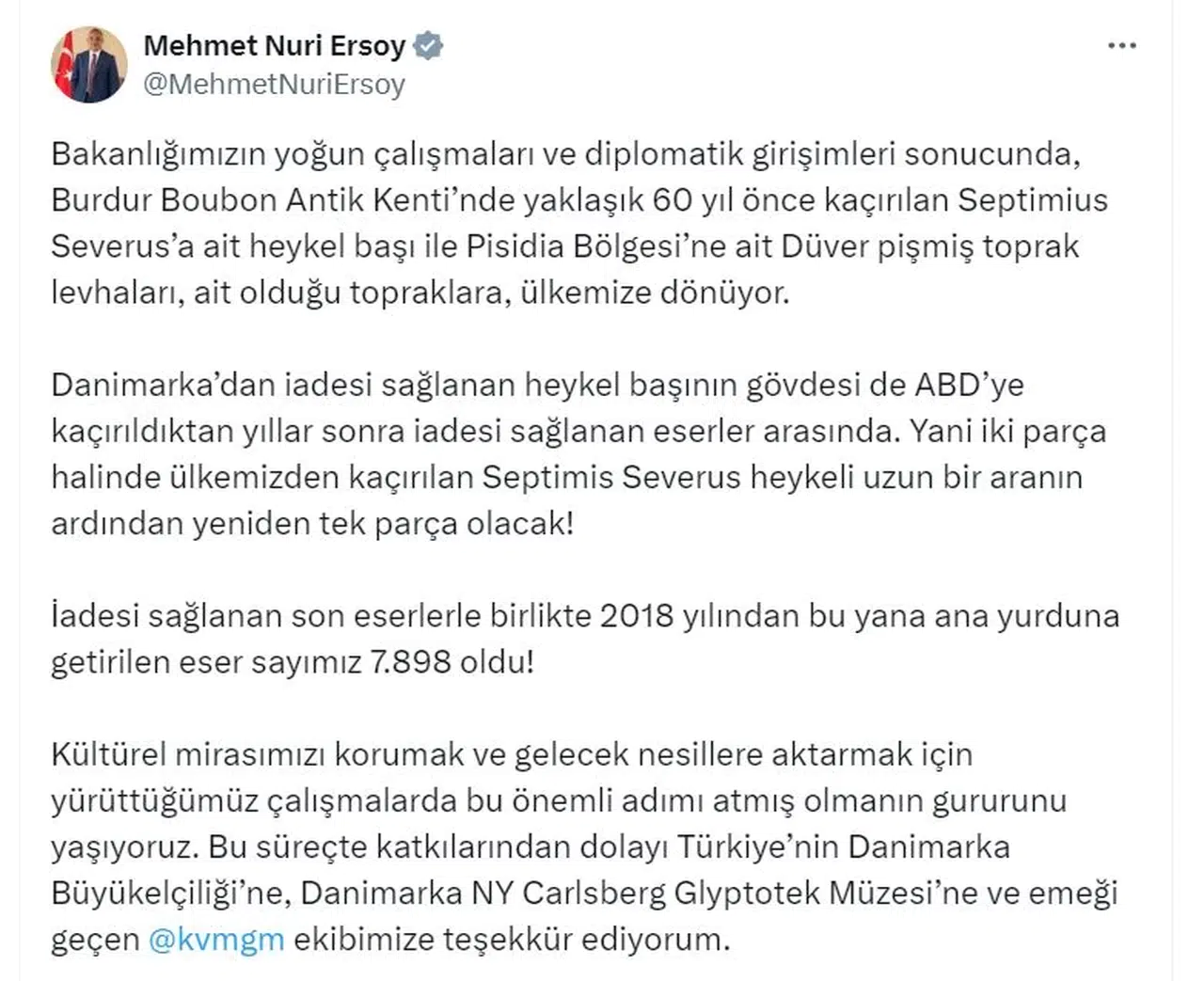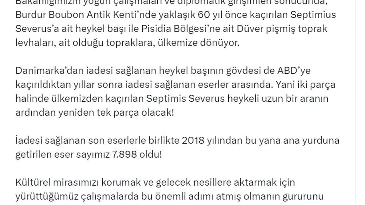 Bakan Ersoy, sosyal medya hesabından yaptığı açıklamada, "Bakanlığımızın yoğun çalışmaları ve diplomatik girişimleri sonucunda, Burdur Boubon Antik Kenti'nden yaklaşık 60 yıl önce kaçırılan Septimius Severus'a ait heykel başı ile Pisidia Bölgesi'ne ait Düver pişmiş toprak levhaları, ait olduğu topraklara, ülkemize dönüyor" dedi. Bakan Ersoy, Danimarka’dan iadesi sağlanan heykel başının gövdesinin de ABD'ye kaçırıldıktan yıllar sonra iadesinin sağlandığını hatırlatarak, "Yani iki parça halinde ülkemizden kaçırılan Septimis Severus heykeli uzun bir aranın ardından yeniden tek parça olacak" ifadelerini kullandı.