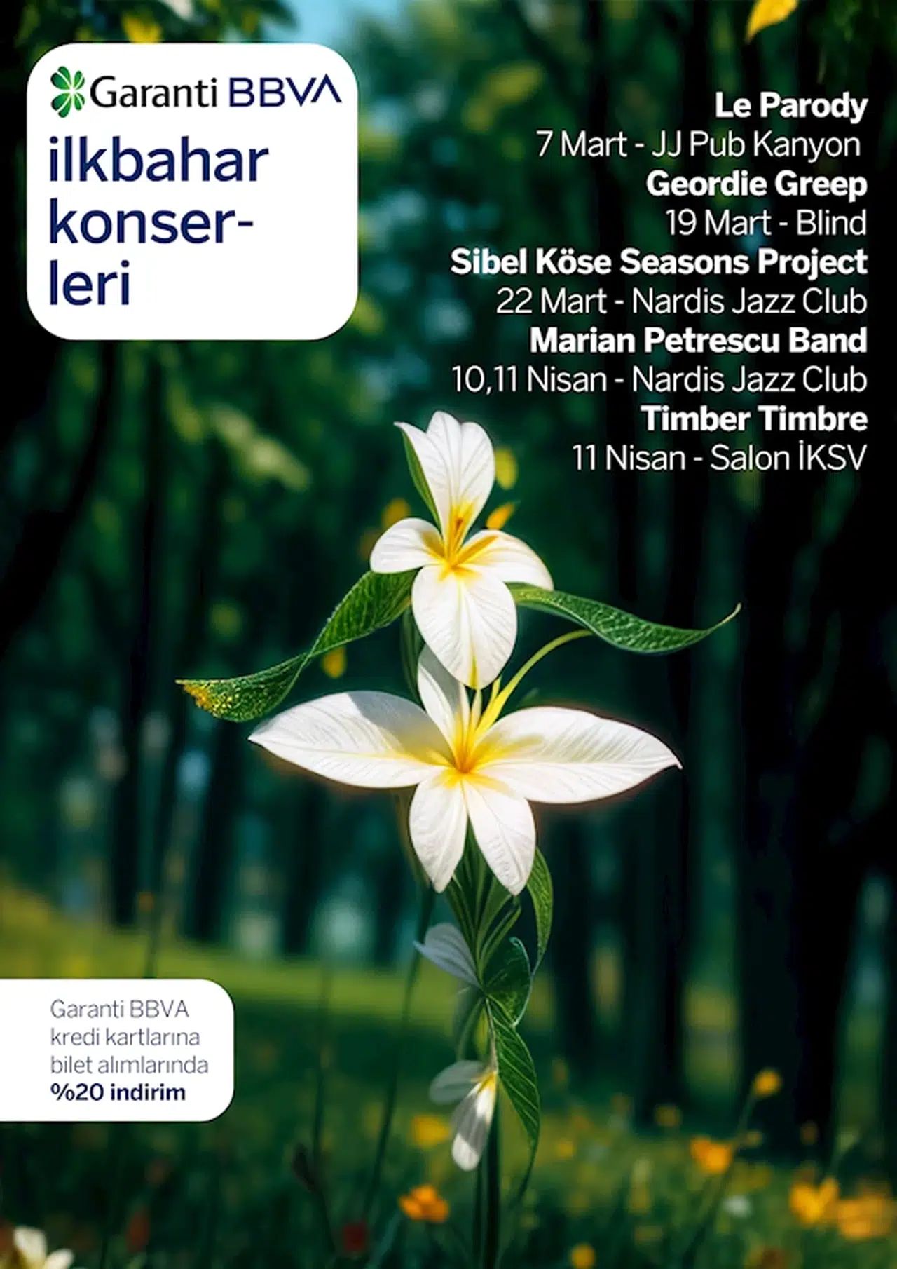 İSTANBUL, (DHA)- GARANTİ BBVA’nın geleneksel ‘Bahar Konserleri’ mart ayında müzikseverlerle buluşuyor. Bahar konserlerinin ilk döneminde, cazdan folk müziğe, deneysel rock’tan elektronik tınılara uzanan geniş bir repertuvarla, yerli ve uluslararası sanatçılar sahne alacak. Gerçekleşecek konserlerde Geordie Greep, Sibel Köse Season Project, Marian Petrescu Band ve Timber Timbre gibi isimler sahne alacak. Garanti BBVA Bahar Konserleri kapsamında düzenlenen etkinliklerde, Garanti BBVA kredi kartlarıyla bilet alımlarında yüzde 20 indirim fırsatı sunulacak.