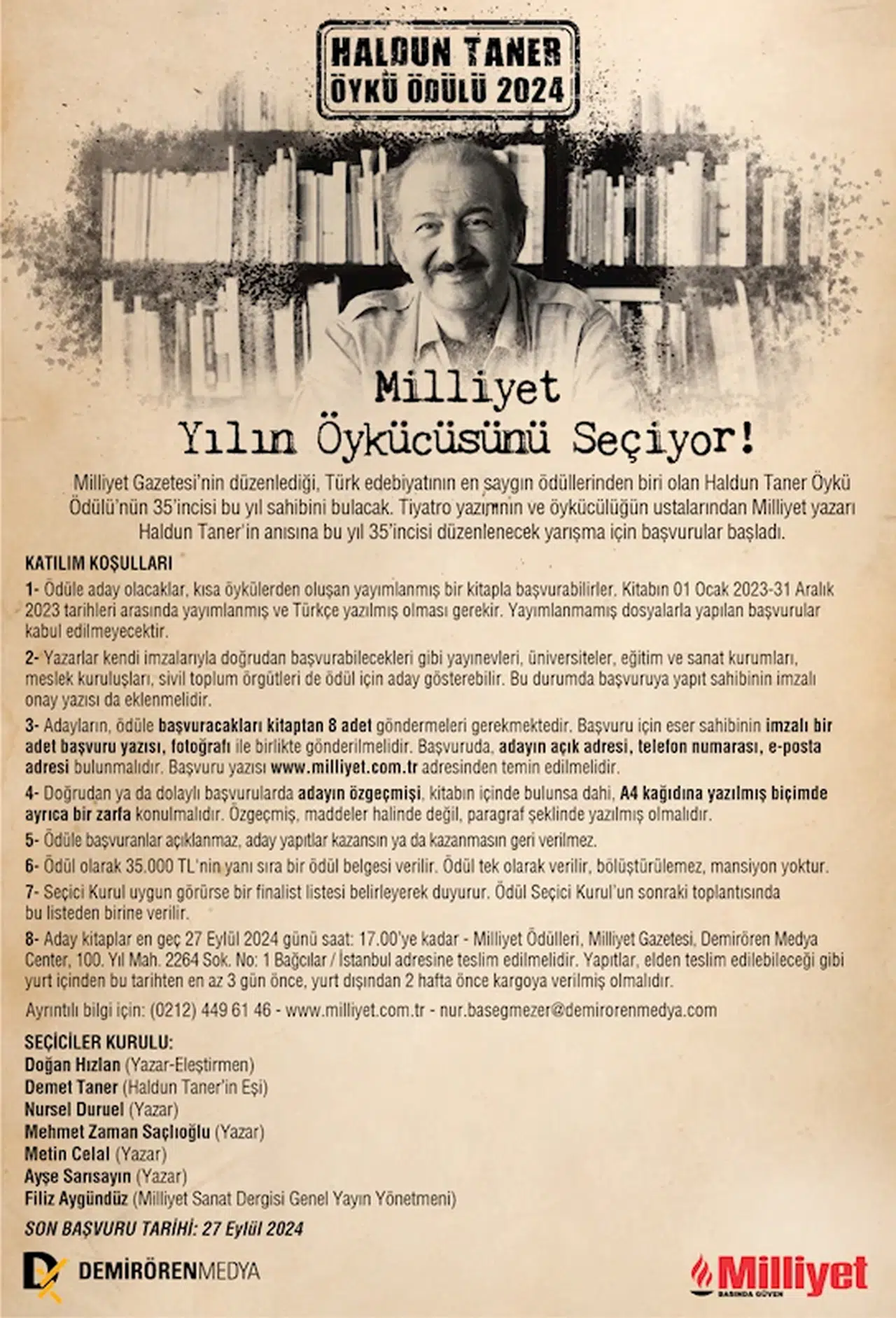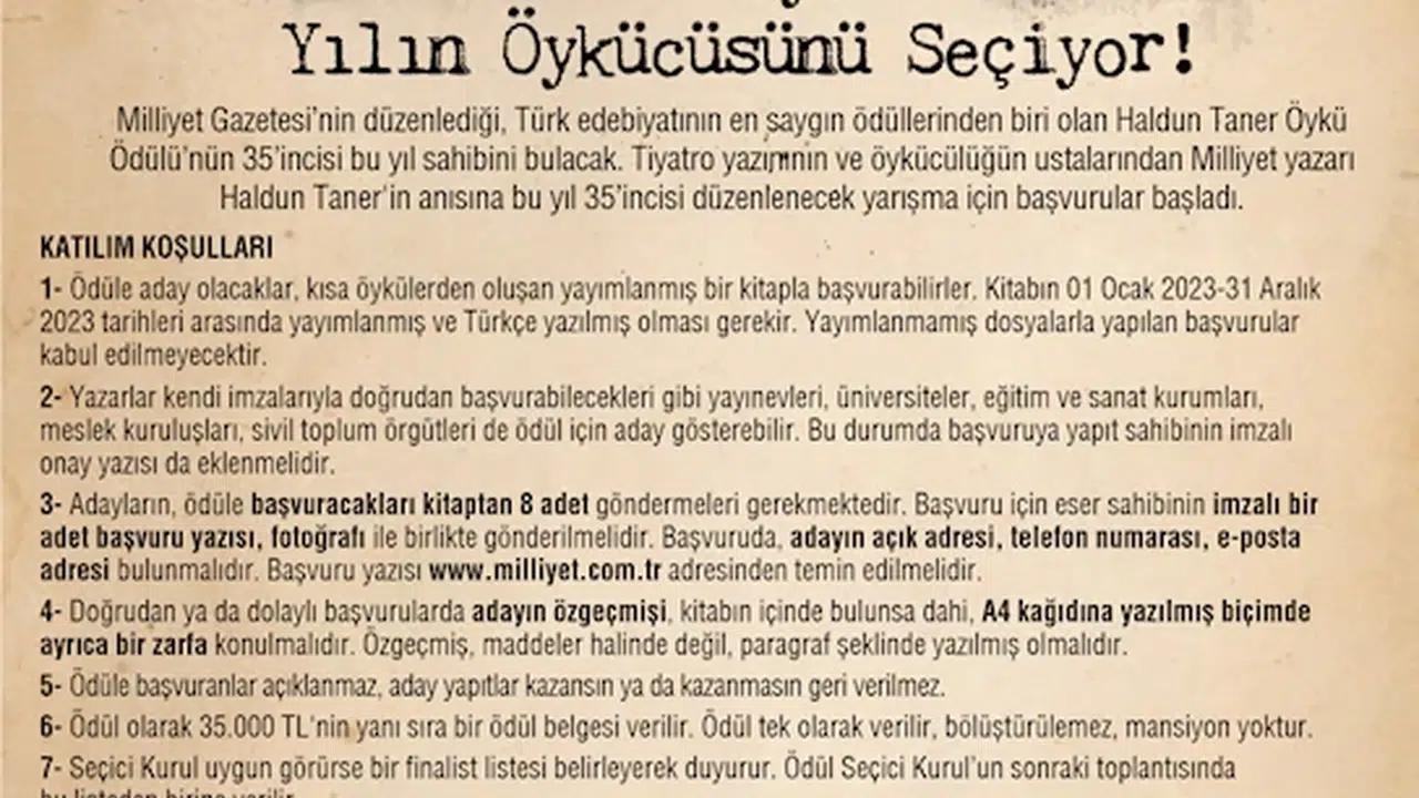 İSTANBUL,(DHA) - Edebiyat dünyasının saygınlığını devam ettirmek anlayışıyla gerçekleştirilen 'Haldun Taner Öykü Ödülü' yarışması, bu yıl 35'inci kez yılın öykücüsünü seçiyor. Milliyet Gazetesi’nin düzenlediği yarışma, 27 Eylül tarihine kadar başvuruları kabul ediyor.