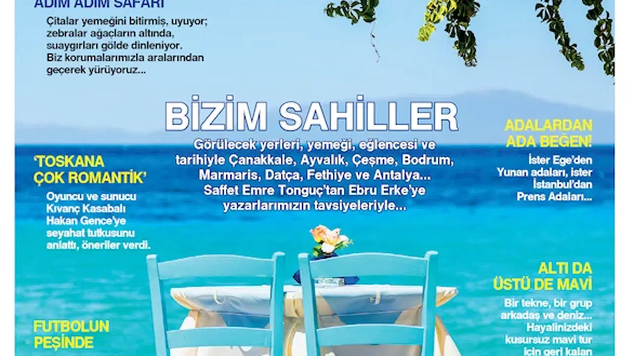 Çanakkale'den Antalya'ya, binlerce kilometrelik kıyılarımızdan en güzel sahiller, huzurlu koylar, konforlu konaklama önerileri, lezzetli ve eğlenceli adresler. Türkiye'nin her yerinden en iyi beach'ler ve en iyi halk plajları. Yemyeşil ve serin bir tatil isteyenlereyse Karadeniz yaylaları. Ayrıca sahilde okunacak kitaplar, bavula bu yaz mutlaka konması gerekenler, gezginlerden, seyahat severlerden öneriler de bu dergide.