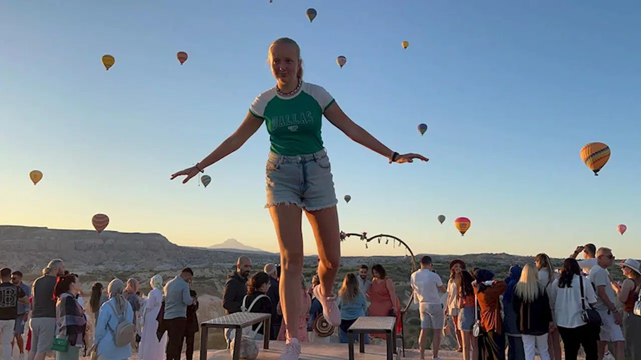Adana'dan bölgeye gelen Sıla Çağlar, "Bayramı Kapadokya'da geçirmek istedik. Kapadokya'da bu büyüleyici atmosferde bayramı geçirmek eşsiz bir deneyim oluyor. Gerçekten çok büyüleyici. Bence herkesin balona binmesi ve izlemesi gerekiyor. Biz şu an sadece izleyebiliyoruz" diye konuştu. (DHA)