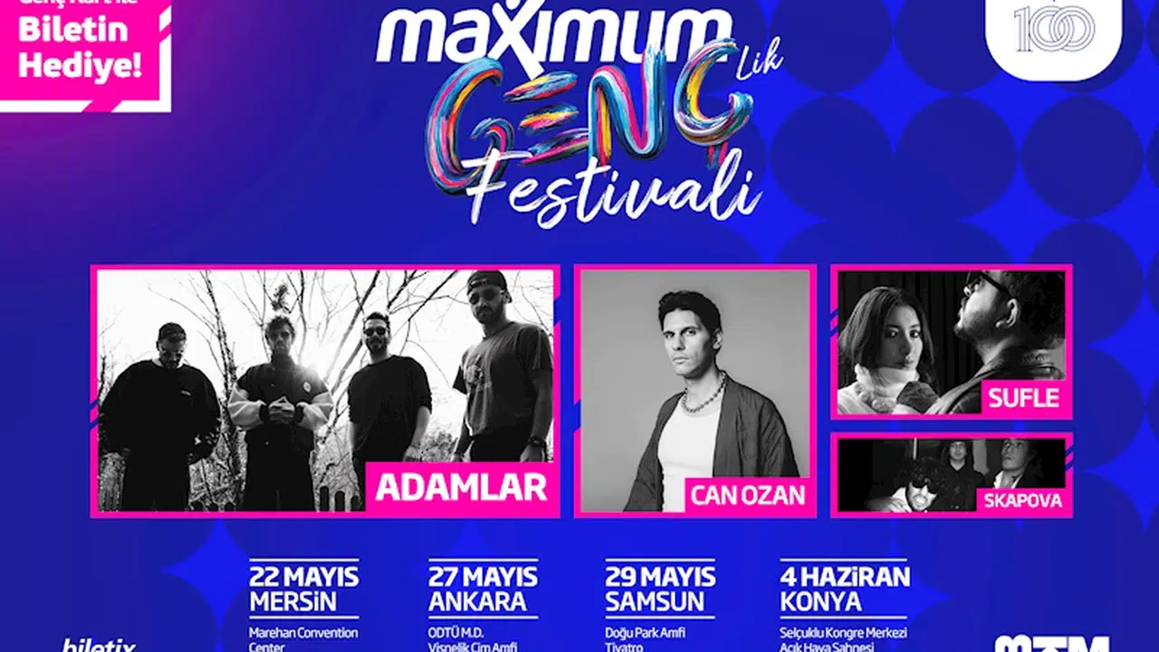 Türkiye İş Bankası ve BKM iş birliğiyle düzenlenen Maximum Gençlik Festivali, bu yıl Mayıs ve Haziran aylarında 4 ilde gerçekleştirilecek. Adamlar, Can Ozan, Sufle ve Skapova, 22 Mayıs’ta Mersin Marehan Convention Center, 27 Mayıs’ta Ankara ODTÜ M.D. Vişnelik Tesisleri Çim Amfi, 29 Mayıs’ta Samsun Doğu Park Amfi Tiyatro, 4 Haziran’da Konya Selçuklu Kongre Merkezi Açık Hava Sahnesi’nde gençlerle buluşacak. DJ ve MC’nin de katılımlarıyla festival coşkusu katlanarak yaşanacak.