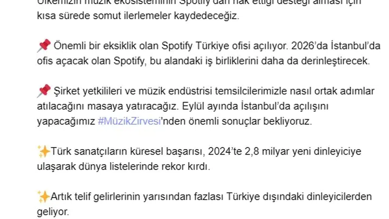 Bakan Ersoy, NSosyal hesabından yaptığı açıklamada, "Küresel müzik endüstrisinin öncülerinden Spotify ile yaptığımız toplantıda önemli adımlar için kararlar aldık. Ülkemizin müzik ekosisteminin, Spotify'dan hak ettiği desteği alması için kısa sürede somut ilerlemeler kaydedeceğiz. Önemli bir eksiklik olan Spotify Türkiye Ofisi açılıyor. 2026'da İstanbul’da ofis açacak olan Spotify, bu alandaki iş birliklerini daha da derinleştirecek. Şirket yetkilileri ve müzik endüstrisi temsilcilerimizle nasıl ortak adımlar atılacağını masaya yatıracağız. Eylül ayında İstanbul'da açılışını yapacağımız Müzik Zirvesi'nden önemli sonuçlar bekliyoruz. Türk sanatçıların küresel başarısı, 2024'te 2,8 milyar yeni dinleyiciye ulaşarak dünya listelerinde rekor kırdı. Artık telif gelirlerinin yarısından fazlası Türkiye dışındaki dinleyicilerden geliyor. Genç yetenekleri ve kadın sanatçıları da destekleyecek bu güçlü iş birliği, kültürel diplomasimize de yeni bir ivme kazandıracak. Türkiye'nin zengin müzik mirasını ve kültürünü dünyaya tanıtacak bu ve benzeri adımlarda Spotify ekibiyle yakın çalışmaya devam edeceğiz" ifadelerini kullandı.