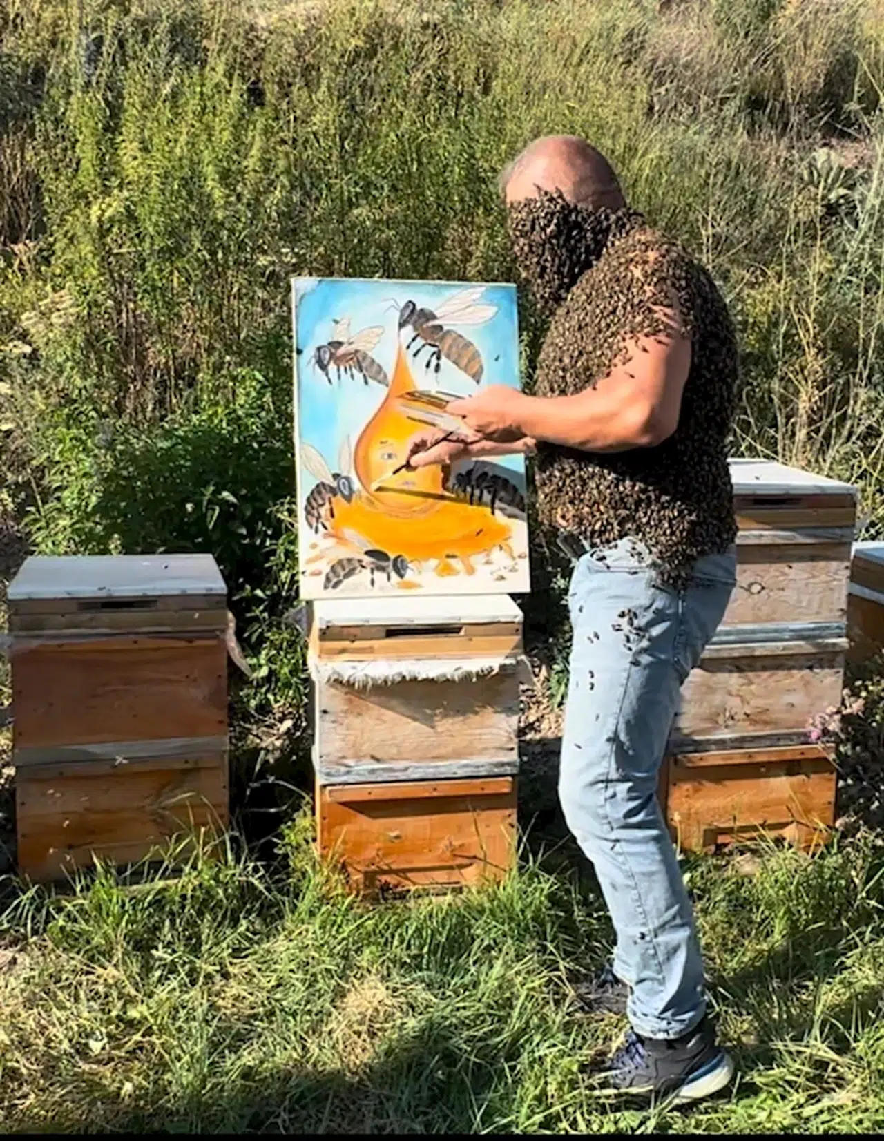 Bedir ALTUNOK / KARS (DHA)- KARS’ta arıcılık yapan heykeltıraş-ressam Yücel Üzeyir, vücudunu konan binlerce arıyla dünya genelindeki savaşlara dikkat çekti. Üzeyir, arılar üzerindeyken bal damlası üzerine ağlayan bir kız çocuğu resmi çizerek savaşların durmasını istedi.