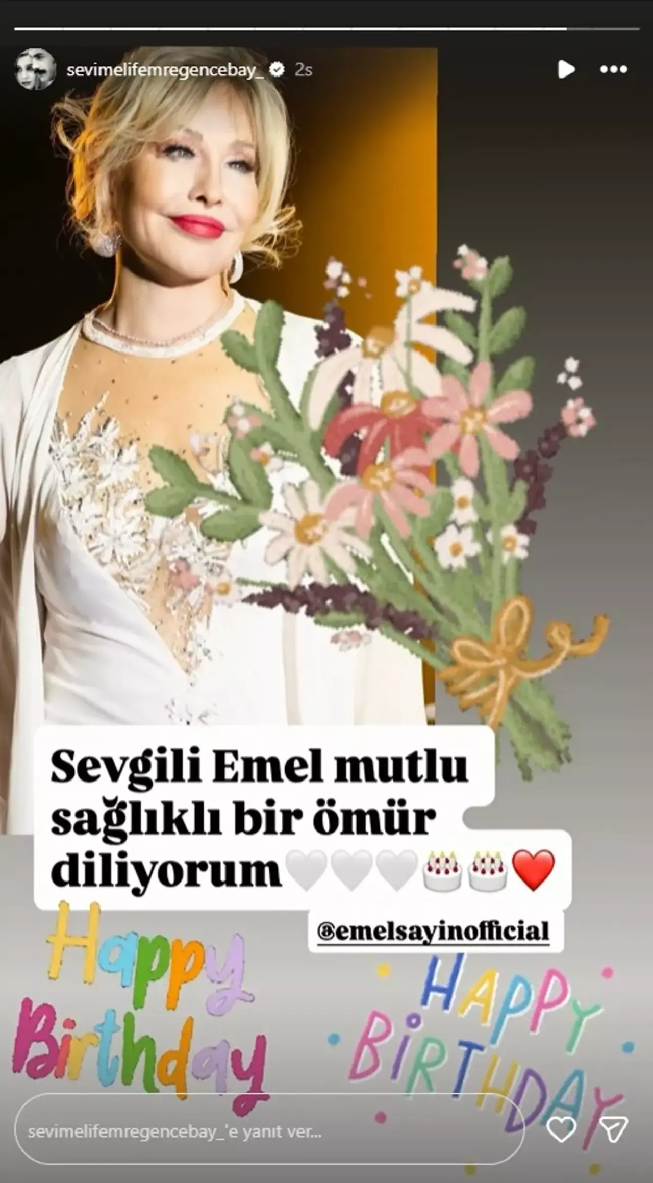 Sevim Emre, sosyal medya hesabından yaptığı paylaşımda Emel Sayın’a, “Sevgili Emel, mutlu ve sağlıklı bir ömür diliyorum” ifadelerini kullandı. Mesaj kısa sürede büyük ilgi gördü ve takipçiler tarafından beğeni yağmuruna tutuldu.