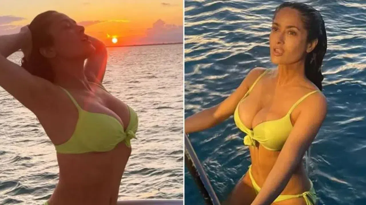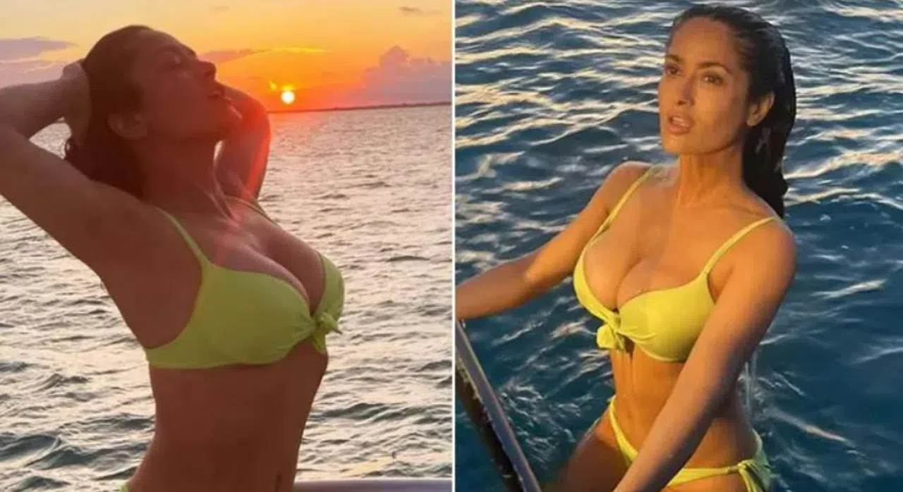 In April, Hayek made a splash as she flaunted her fit body in a bright yellow bikini while she took a dip in the ocean.
