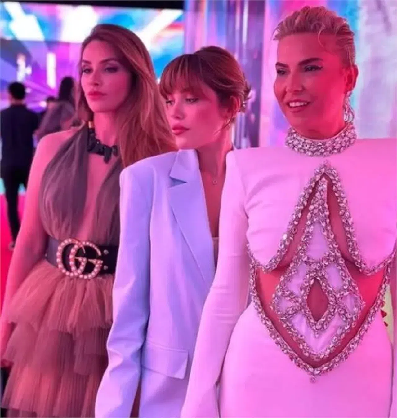 Serenay Sarıkaya, Afra Saraçoğlu, Hande Erçel gibi isimlerin iddialı seçimler yaptığı gecede Dönmez de üstten göğüslerini kapatan dekolteli beyaz işlemeli elbisesiyle dikkat çekti.