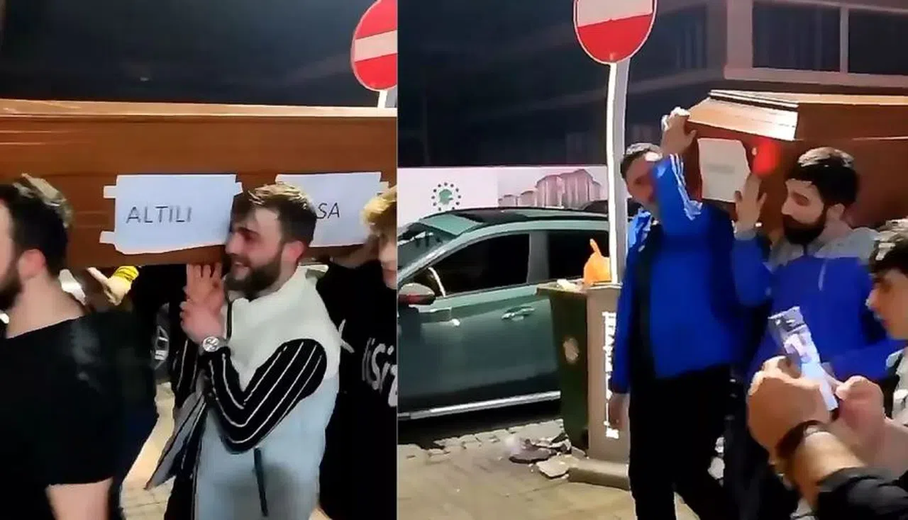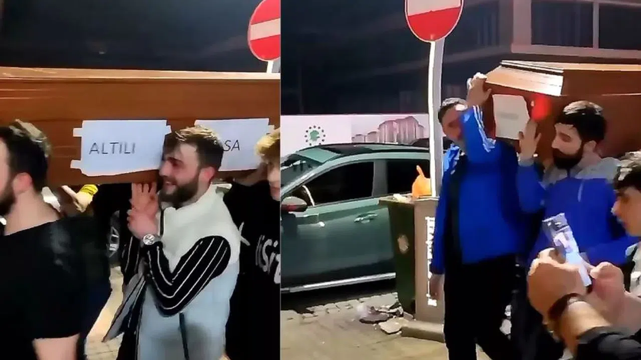 Rize’de üzerinde ‘6’lı masa’ ve ‘28.05.2023’ yazılı tabut önce meydanda gezdirildi, sonra dualar edildi, sonra parçalanıp ateşe verildi.