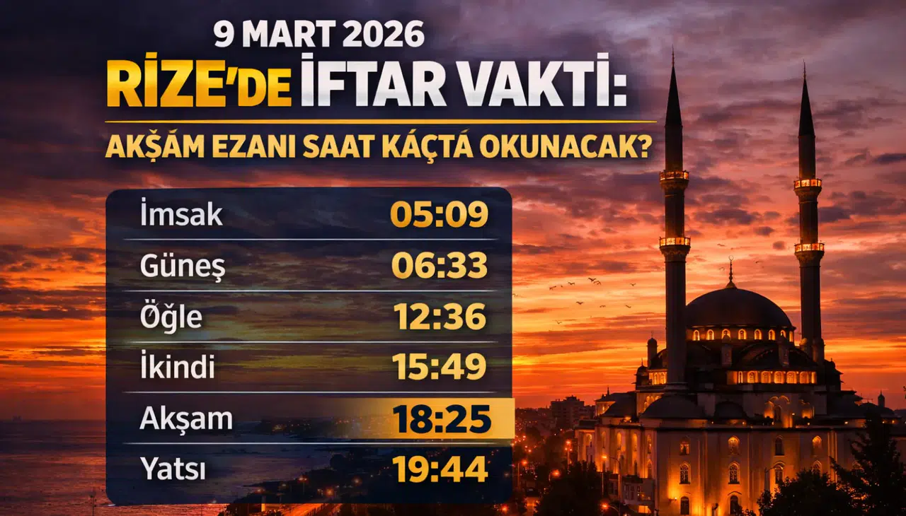 Rize’de yaşayan vatandaşlar, 9 Mart 2026 Pazartesi günü 18.25’te okunacak akşam ezanı ile birlikte iftarlarını açabilecek. Ayrıca sahur yapmak isteyenler için imsak vakti ise 05.09 olarak açıklandı.