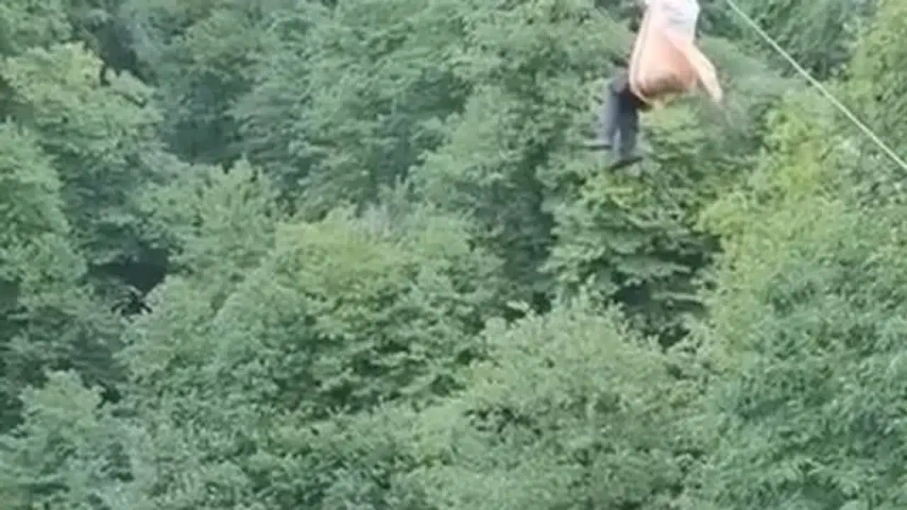 RİZE'de yamaç arazide hasat edilen yaş çay yükü, taşındığı ilkel teleferik arızalanınca metrelerce yüksekte asılı kaldı. Tellere tutunan 2 kişi, çayları bulunduğu yerden çekerek yola çıkardı. O anlar cep telefonu kamerasına yansıdı.