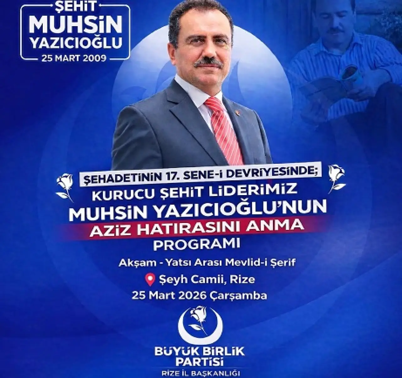Büyük Birlik Partisi (BBP) Rize İl Başkanlığı, merhum lider Muhsin Yazıcıoğlu’nun şehadetinin 17. yıl dönümü dolayısıyla anma programı düzenleyeceğini duyurdu. İl Başkanı Ensar Özçelik tarafından yapılan açıklamada, programa tüm vatandaşlar davet edildi.