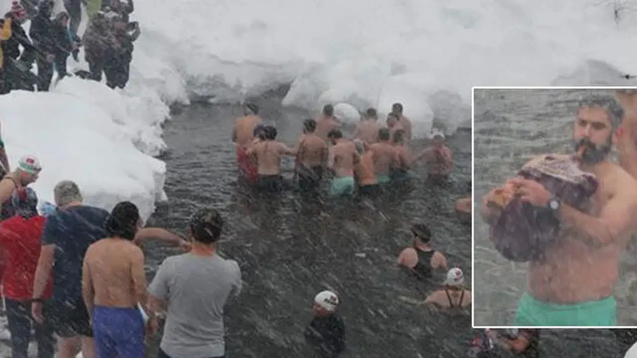 DHA'daki habere göre katılımcılar, soğuğa rağmen sıfır derece sıcaklıktaki göle girdi. 40 kişi, suya girmeyi tercih ederken, diğer katılımcılar da yüzenleri izleyip, o anları cep telefonuyla kayda aldı. Sudan çıkan katılımcılar, ateş başına geçerek ısınmaya çalıştı.