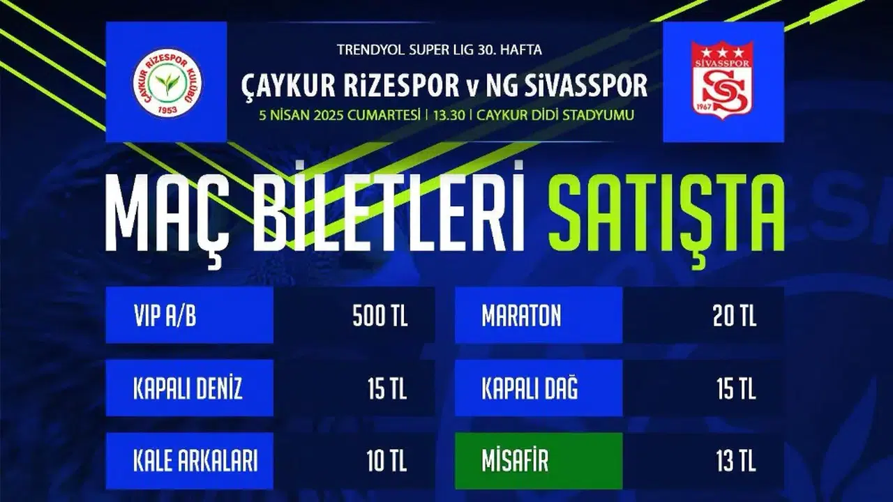 Trendyol Süper Lig’in 30. haftasında Çaykur Rizespor, Net Global Sivasspor’u konuk edecek. 5 Nisan Cumartesi günü saat 13.30’da Çaykur Didi Stadyumu’nda oynanacak karşılaşmanın biletleri bugün saat 11.00 itibarıyla satışa çıktı.