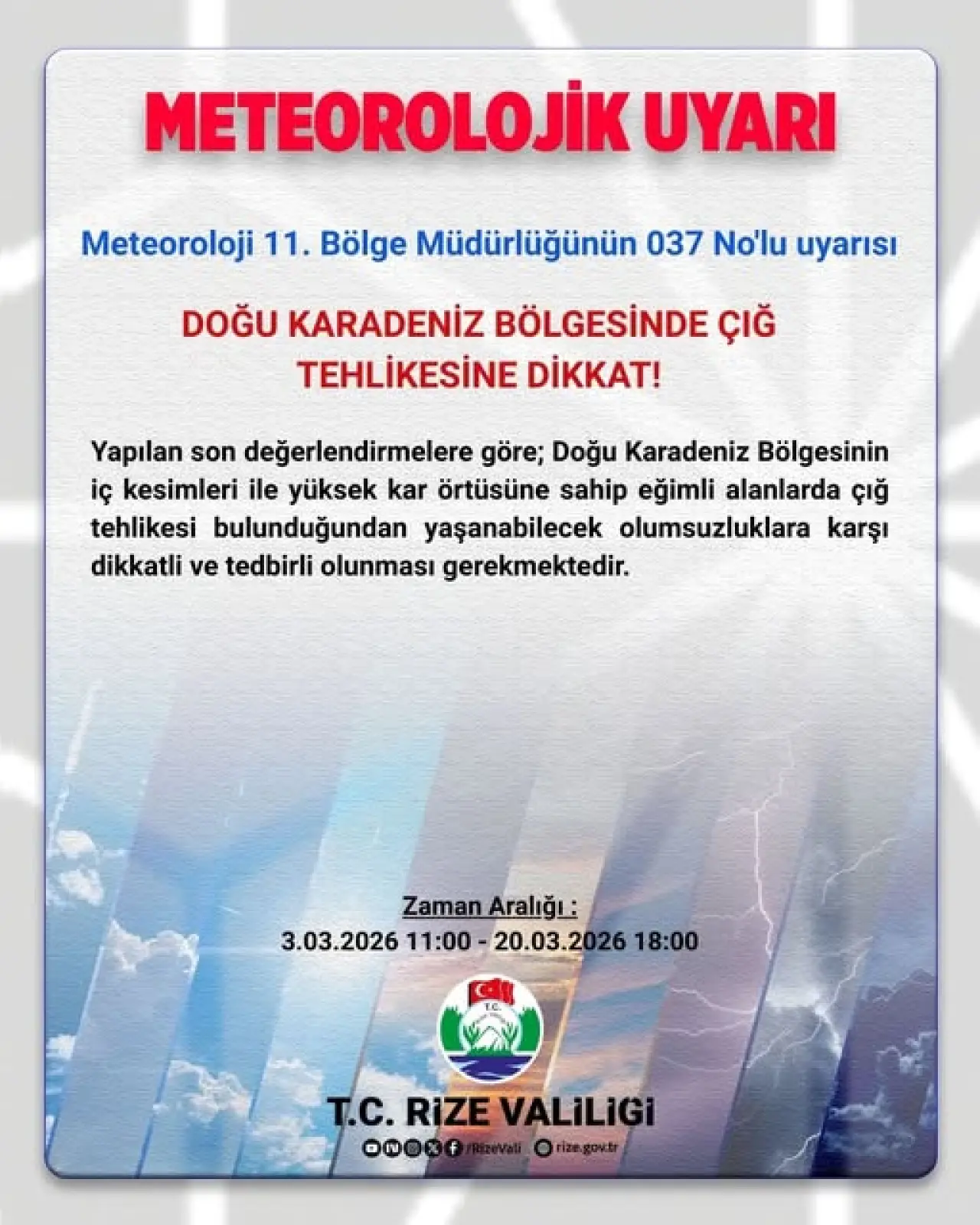 Çığ tehlikesine ilişkin uyarının 3 Mart 2026 saat 11.00 ile 20 Mart 2026 saat 18.00 tarihleri arasında geçerli olacağı bildirildi.