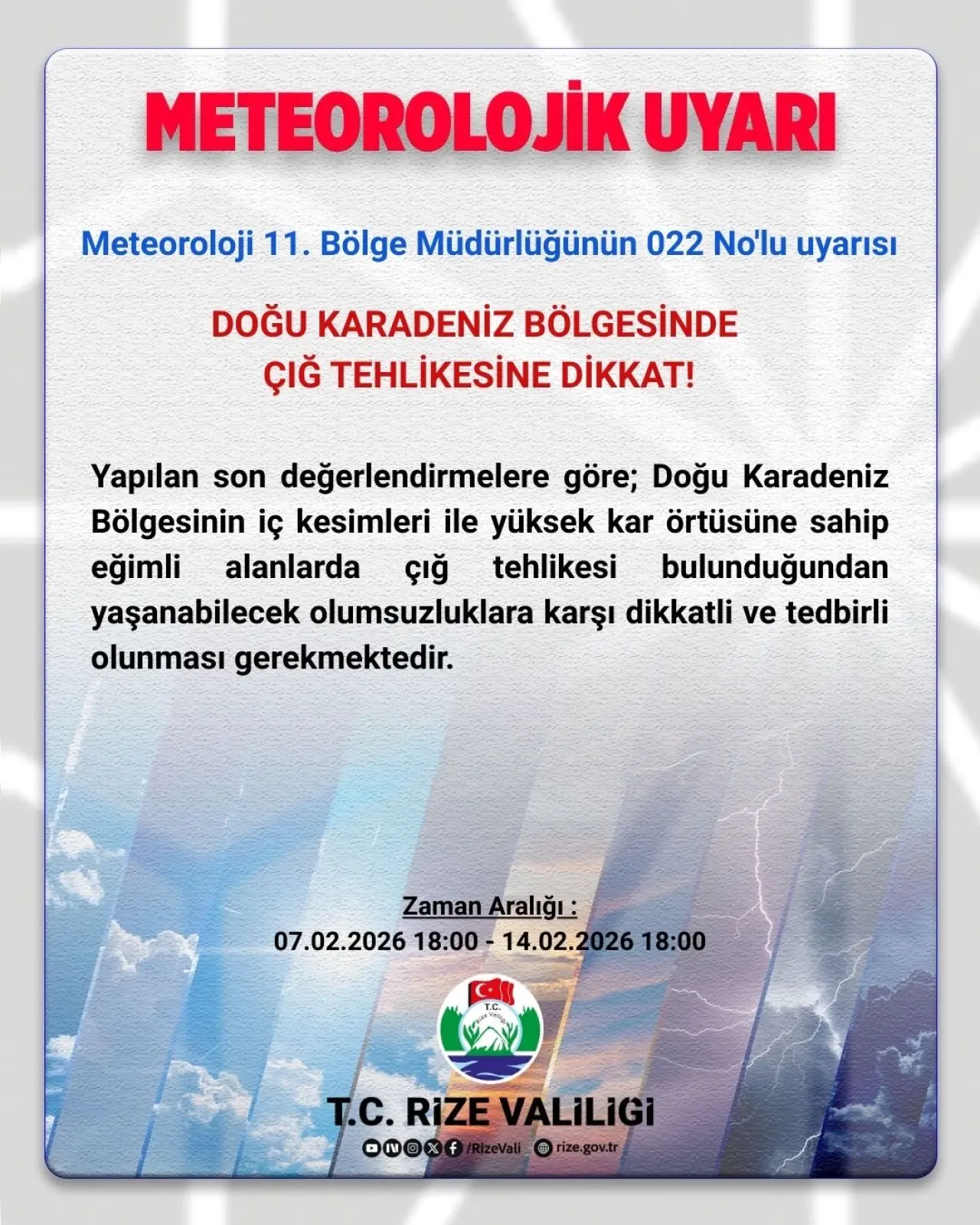 Rize Valiliği tarafından yapılan açıklamada uyarının 07 Şubat 2026 saat 18.00 ile 14 Şubat 2026 saat 18.00 tarihleri arasında geçerli olacağı bildirildi. Bu süreçte zorunlu olmadıkça riskli bölgelerde bulunulmaması tavsiye edildi.