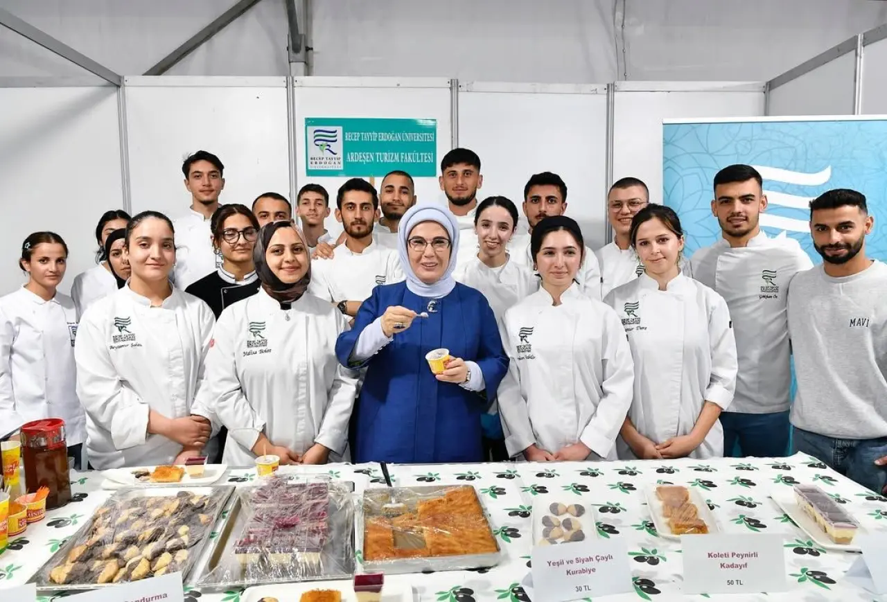 Cumhurbaşkanı Recep Tayyip Erdoğan'ın eşi Emine Erdoğan, Rize'nin gastronomik zenginliklerini kutlamak amacıyla bu yıl beşincisi düzenlenen Rize Gastronomi Günleri'ni ziyaret etti. "Aromatik Mutfak Kültürü'nün Yeşil Sofrası" temasıyla gerçekleştirilen bu etkinlikte, stantları gezerek kadın üreticiler ve şeflerle buluştu.