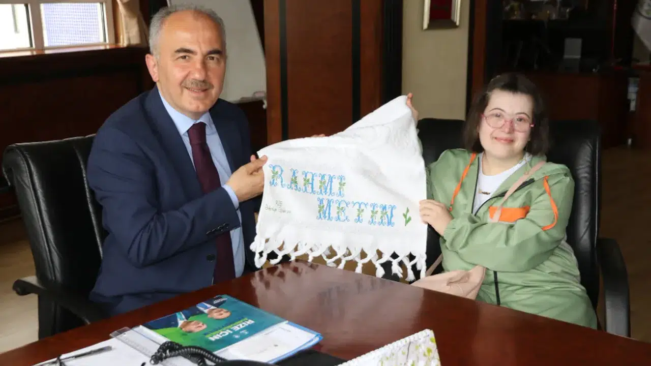Rize Belediyesi Engelsiz Yaşam Merkezi öğrencilerinden Nisanur Uçar ailesiyle beraber Rize Belediye Başkanı Rahmi Metin'i makamında ziyaret ederek, Rize'ye kazandırılan Engelsiz Yaşam Merkezi için teşekkür etti.