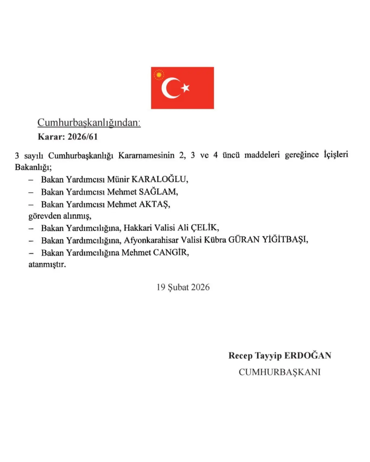 Resmi Gazete’de yayımlanan karar doğrultusunda, boşalan İçişleri Bakan Yardımcılığı görevlerine yeni atamalar yapıldı. Afyonkarahisar Valisi Kübra Güran Yiğitbaşı, Hakkari Valisi Ali Çelik ve Mehmet Cangir İçişleri Bakan Yardımcılığı görevine getirildi.