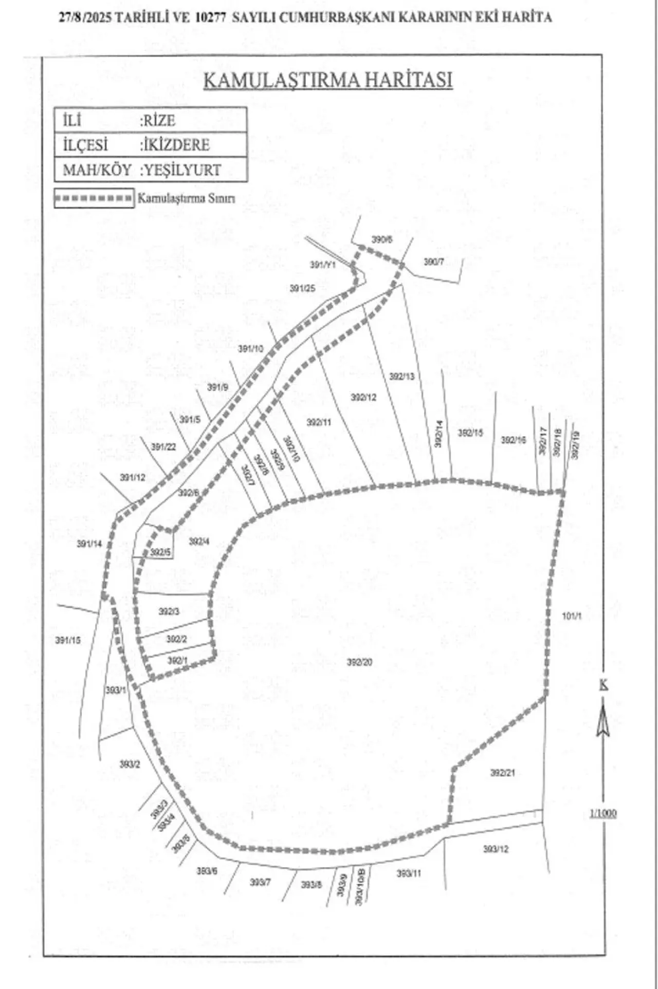 “Rize ili, İkizdere ilçesi, Yeşilyurt Mahallesi’nde bulunan ve ekli haritada sınırları gösterilen alanda yer alan özel mülkiyete konu taşınmazların, bölgede ihtiyaç duyulan sosyal konut projesinin gerçekleştirilmesi amacıyla Toplu Konut İdaresi Başkanlığı tarafından acele kamulaştırılmasına, 2942 sayılı Kamulaştırma Kanununun 27’nci maddesi gereğince karar verilmiştir.”