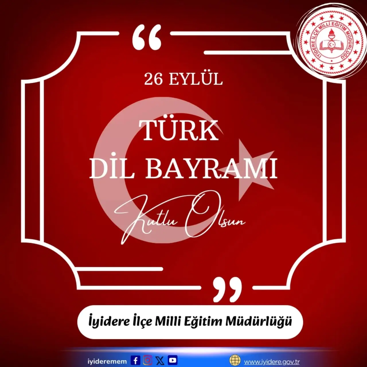 İyidere’de 26 Eylül Dil Bayramı, İyidere İlçe Milli Eğitim Müdürlüğü tarafından sosyal medya üzerinden yapılan anlamlı bir paylaşım ile kutlandı. Türk dilinin korunması ve gelecek nesillere aktarılmasının önemine dikkat çeken bu özel gün, her yıl 26 Eylül’de coşkuyla anılıyor.