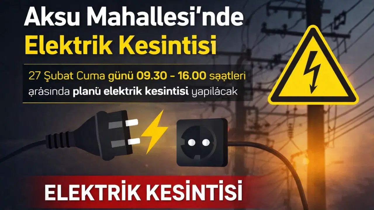 Aksu Mahallesi’nde planlı elektrik kesintisi uygulanacağı bildirildi. Yapılan duyuruya göre, 27 Şubat 2026 Cuma günü (yarın) saat 09.30 ile 16.00 arasında mahallede kısmen elektrik kesintisi yaşanacak.