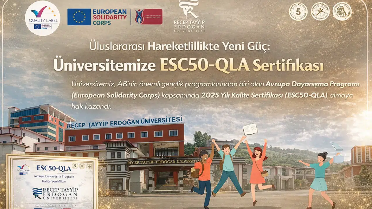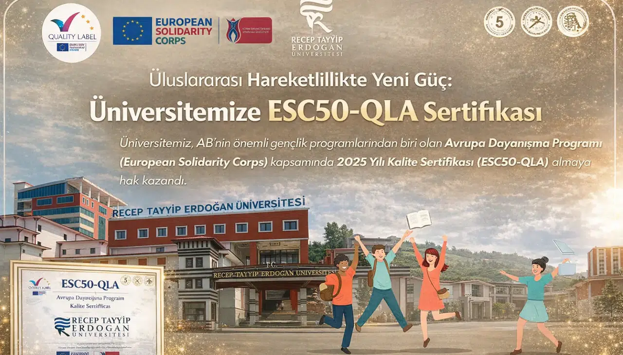 Recep Tayyip Erdoğan Üniversitesi, Avrupa Dayanışma Programı kapsamında 2025 Yılı ESC50-QLA Kalite Sertifikası alarak gençlerin sosyal katılımı, gönüllülük faaliyetleri ve uluslararası hareketlilik alanında önemli bir başarıya imza attı.
