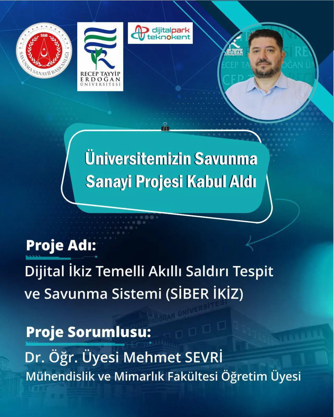 Recep Tayyip Erdoğan Üniversitesi, Cumhurbaşkanlığı Savunma Sanayi Başkanlığı’nın Yeni Nesil Yapay Zekâ Yöntemleri Geliştirilmesi (SAGA) çağrısı kapsamında başlatılan Dijital İkiz Temelli Akıllı Saldırı Tespit ve Savunma Sistemi (SİBER İKİZ) projesinde alt yüklenici olarak yer aldı.