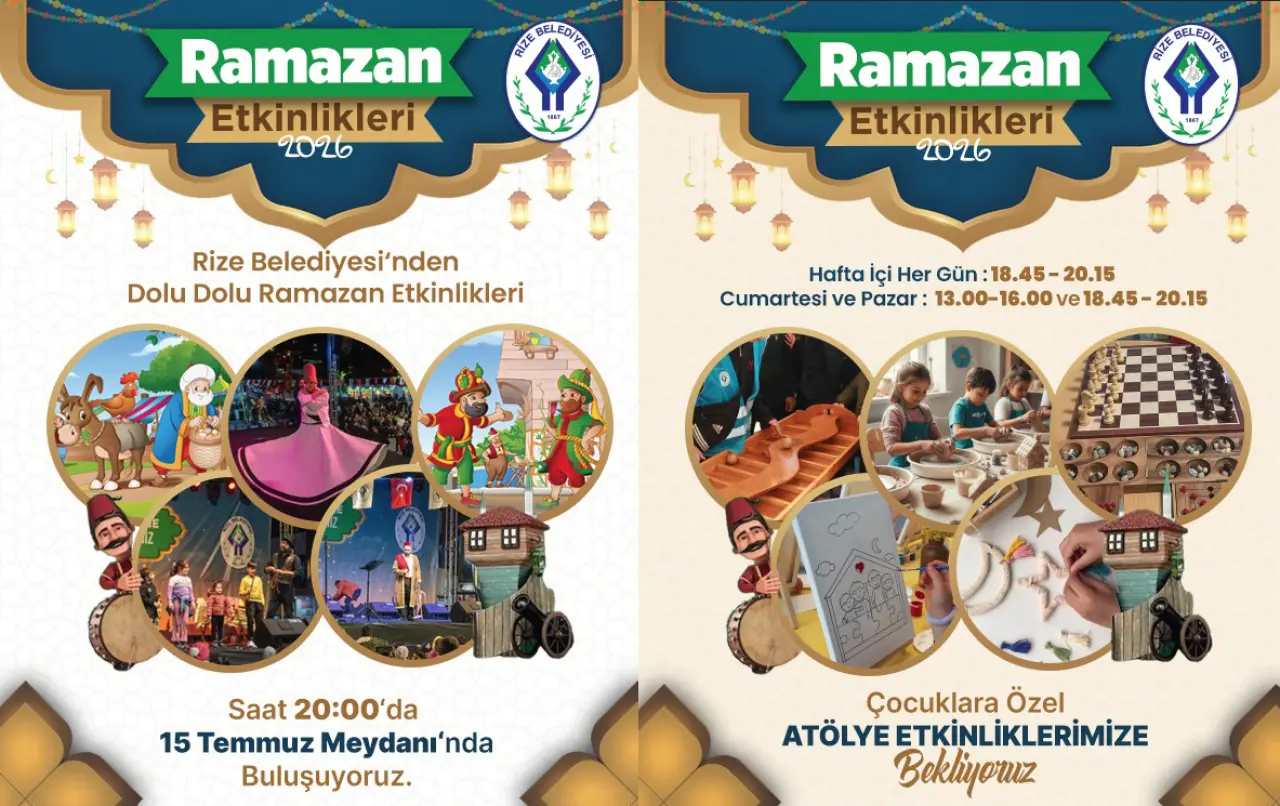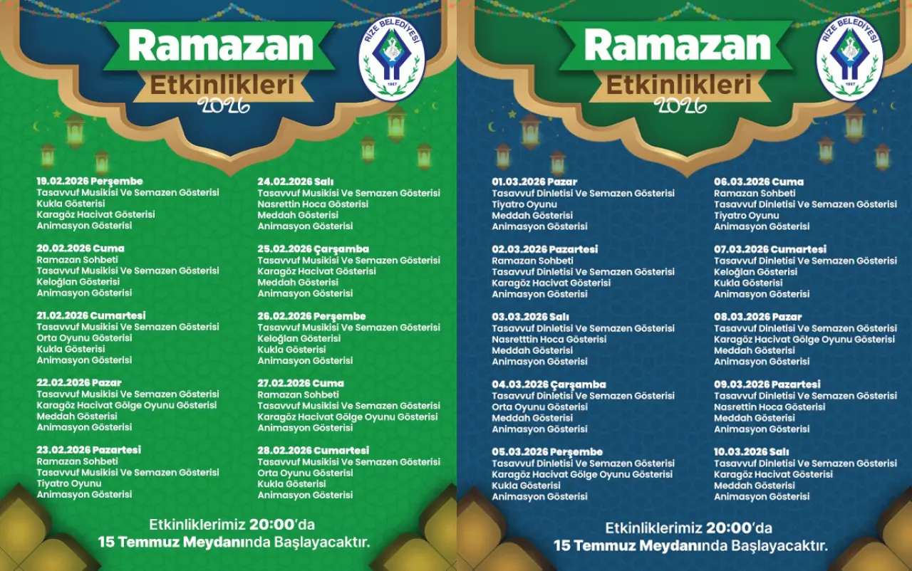 Rize Belediyesi, 2026 Ramazan ayı kapsamında 15 Temmuz Demokrasi ve Cumhuriyet Meydanı’nda dev etkinlik çadırı kurdu. 19 Şubat – 10 Mart tarihleri arasında düzenlenecek Ramazan etkinliklerinde tasavvuf musikisi, geleneksel gösteriler, Ramazan sohbetleri ve çocuk atölyeleri yer alacak.