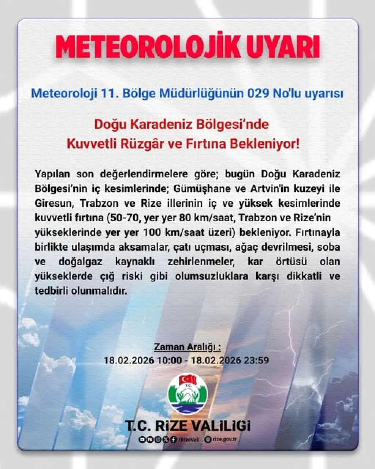 Meteorolojik uyarının 18 Şubat 2026 saat 10.00 ile 23.59 arasında geçerli olacağı bildirildi. Rize Valiliği, gelişmelerin yakından takip edildiğini ve vatandaşların resmi açıklamaları dikkate almaları gerektiğini vurguladı.