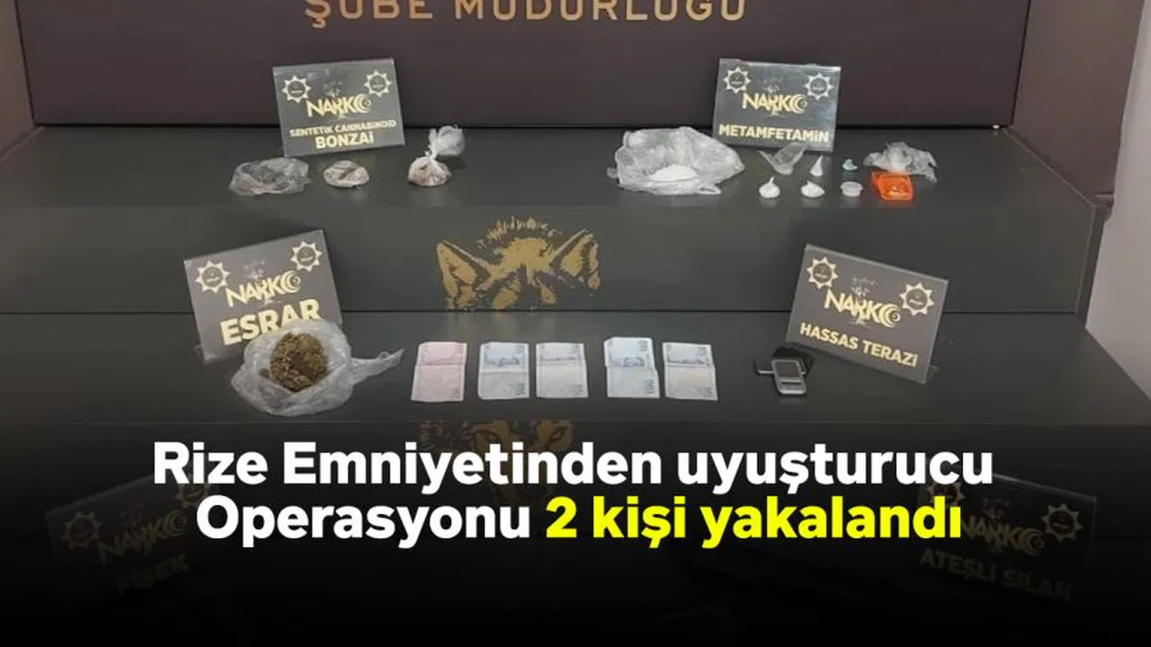 Rize Emniyet Müdürlüğü Narkotik Suçlarla Mücadele Şube Müdürlüğü görevlilerince yapılan çalışmalar kapsamında teknik analizler sonucu tespit edilen bir araç İl Merkezi Sanayi Kavşağında yakalandı. Araç içindeki şahsın yapılan üst ve araç aramasında; 4 parça halinde toplam ağırlığı 4,14 gram olan Metamfetamin Maddesi, 3 parça halinde toplam ağırlığı 21,41 gram olan Sentetik Cannobinoid (Bonzai) Maddesi ele geçirildi.