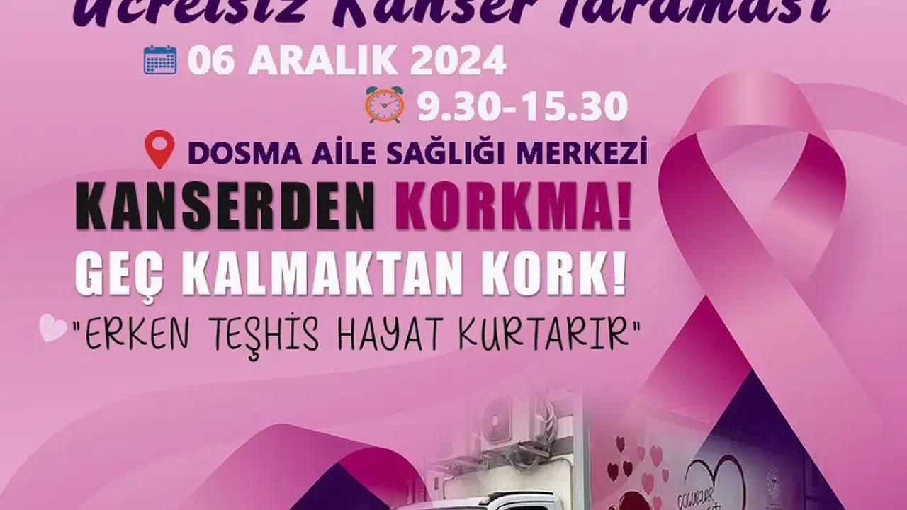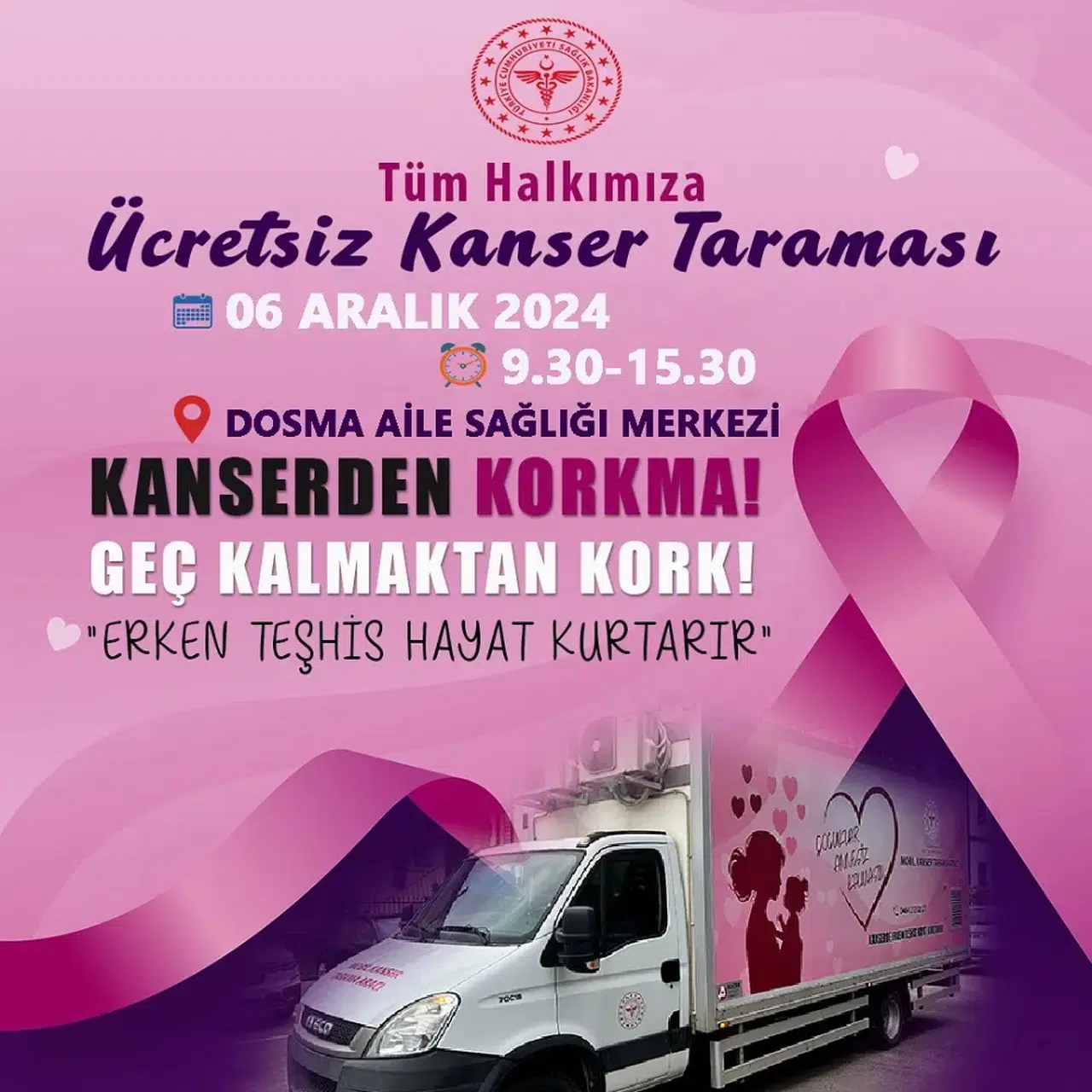 30-65 yaş arası kadınlarda rahim ağzı kanseri, 40-69 yaş arası kadınlarda meme kanseri, 50-70 yaş arası kadın ve erkeklerde bağırsak kanseri taraması ücretsiz olarak yapılmaktadır. Rize İl Sağlık Müdürlüğü Kanser tarama aracımız 06 Aralık 2024 cuma günü saat 09.30 ile 15.30 saatleri arasında Dosma Aile Sağlığı Merkezinde hazır olacaktır. Vatandaşlarımızı ücretsiz taramalarını yaptırmaya davet ediyoruz.