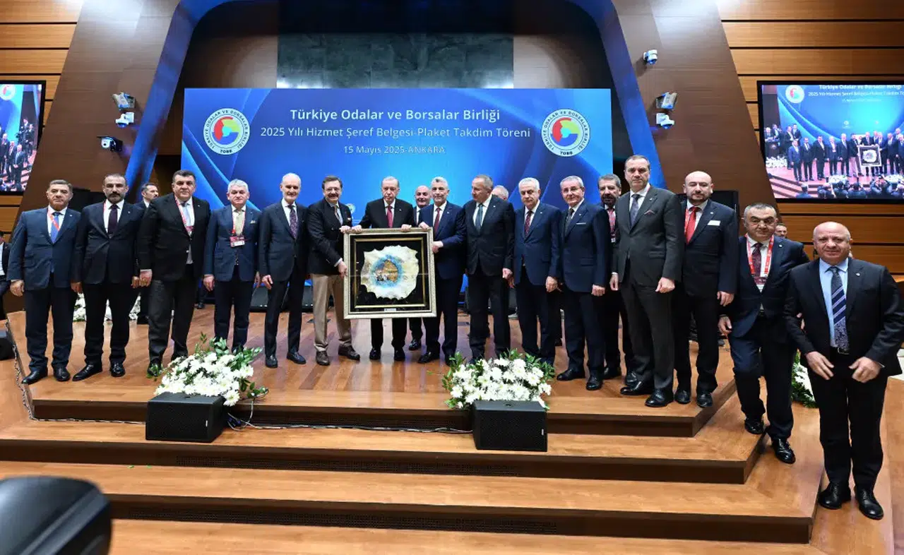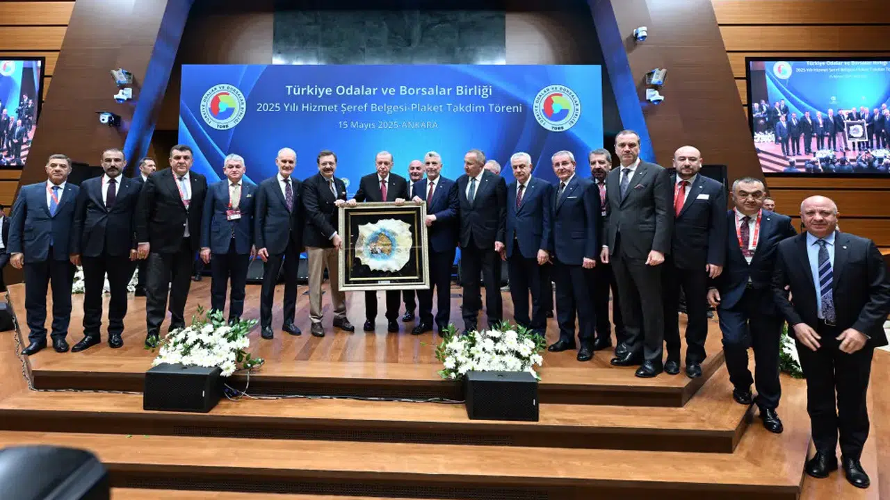 Cumhurbaşkanı Erdoğan, törende 10, 20 ve 30 yıllık hizmetleriyle Şeref Belgesi almaya hak kazanan 98 TOBB üyesini kutladı. “Bu üyeler, Türk ekonomisinin potansiyeline inanarak ülkeye vizyon kattı” diyen Erdoğan, 2002’den bu yana siyasi istikrar ve özel sektör iş birliğiyle ihracatta 36 milyar dolardan 265 milyar dolara, turizmde 13 milyondan 61 milyon ziyaretçiye ulaşıldığını vurguladı. Savunma sanayinde İHA ve SİHA teknolojilerinde dünya liderliğine yükselen Türkiye’nin, TOGG ile otomotivde de iddiasını ortaya koyduğunu belirtti. Erdoğan, TOBB’un 2 milyona yakın üyesinin ihracatın yüzde 99’unu ve istihdamın yüzde 71’ini sağladığını ifade ederek, iş dünyasıyla dayanışmanın süreceğini söyledi.