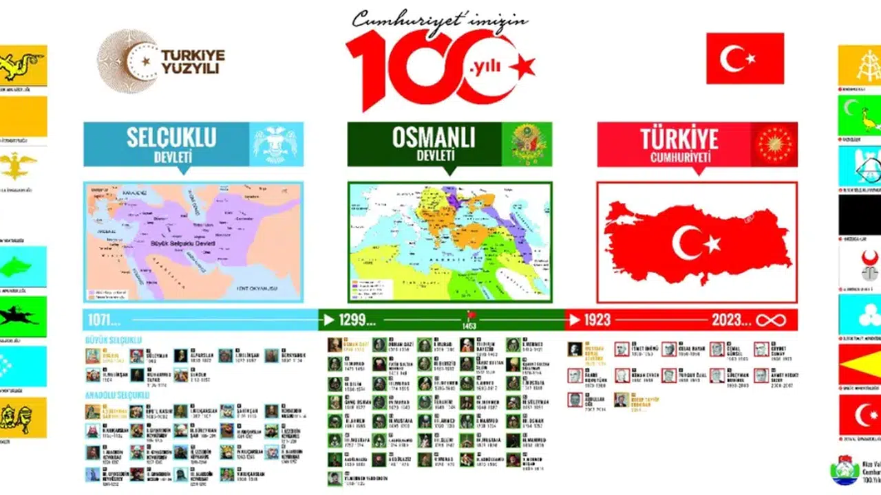 Türk devletlerinin köklü mirasını ve Cumhuriyetimizin kuruluşundan bugüne uzanan yüzyıllık yolculuğunu yansıtan tablo, 16 Türk devletinin bayrakları, hükümdarları ve Türkiye Cumhuriyeti'nin Cumhurbaşkanlarının portreleriyle donatılarak geçmişimizin derin izlerini gelecek nesillere aktarmak üzere tasarlandı.
