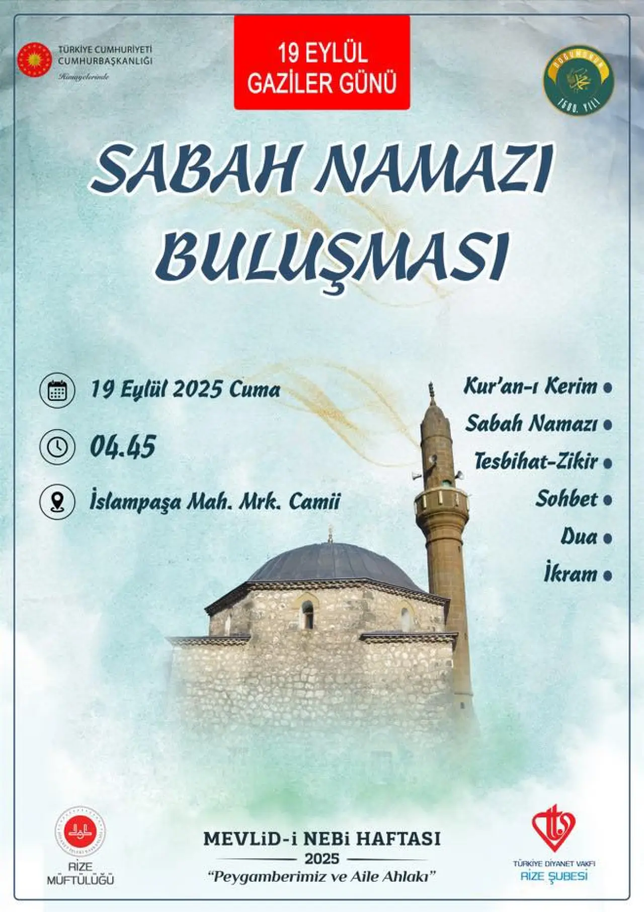 İslampaşa Mahallesi Merkez (Kurşunlu) Camii’nde gerçekleştirilecek olan Sabah Namazı Buluşması, 19 Eylül 2025 Cuma günü saat 04:45’te başlayacak. Etkinlikte, gazilerimiz için dualar edilecek, onların fedakârlıkları ve ülkeye olan hizmetleri bir kez daha hatırlanacak. Rize Müftülüğü, sosyal medya hesabından yaptığı paylaşımda tüm vatandaşları bu anlamlı buluşmaya katılmaya davet etti.