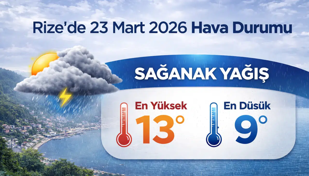 23 Mart 2026 Pazartesi günü Rize’de hava çok bulutlu ve sağanak yağışlı olacak. Gün içinde sıcaklık 13 dereceye kadar yükselirken, en düşük sıcaklık 9 derece olarak ölçülecek.