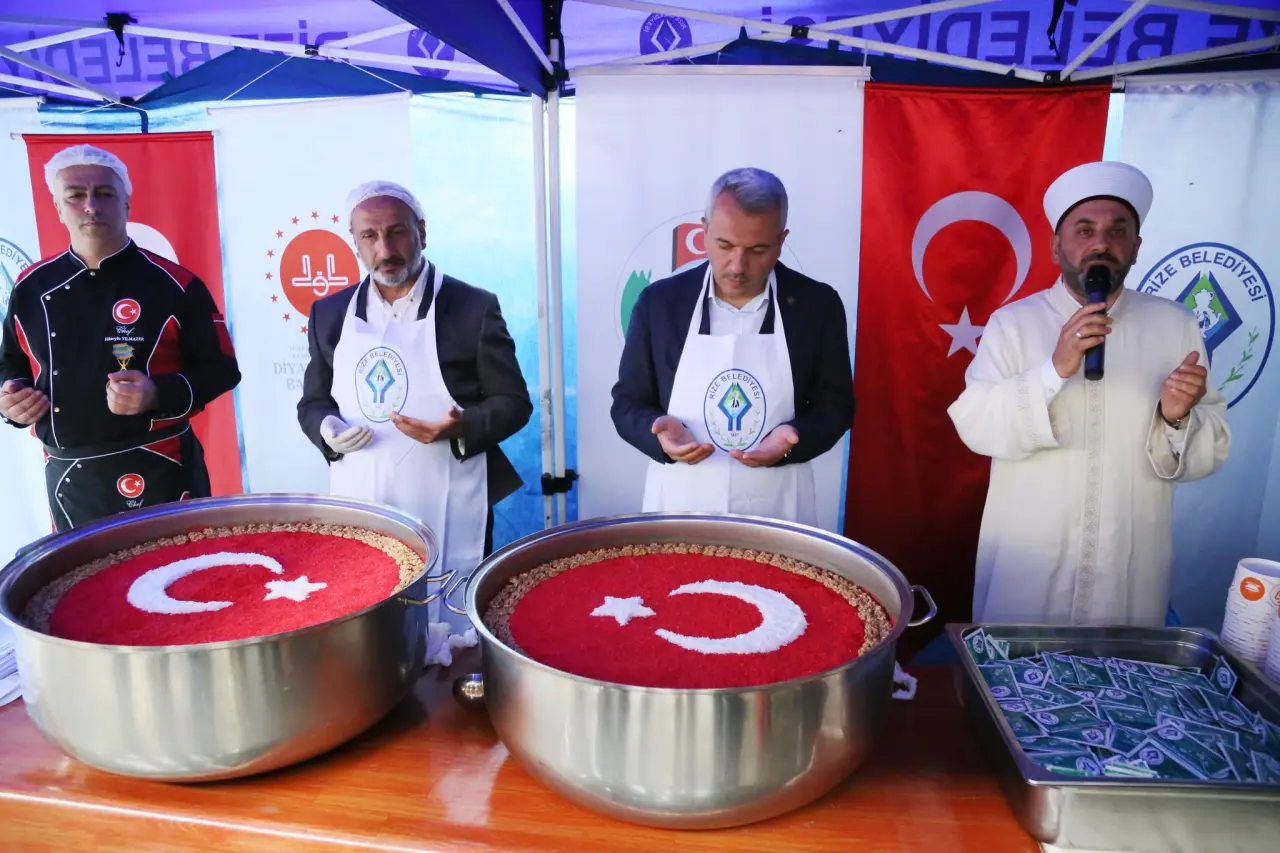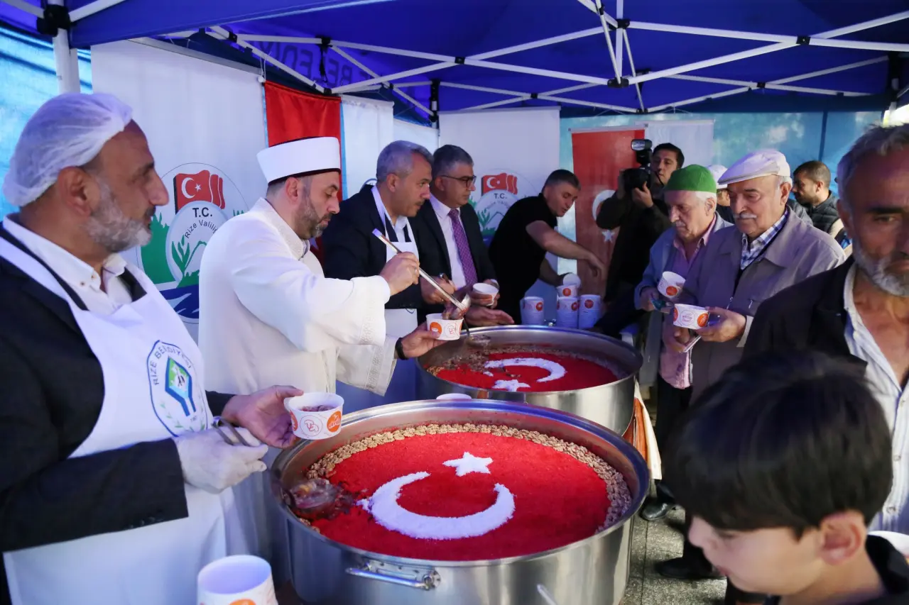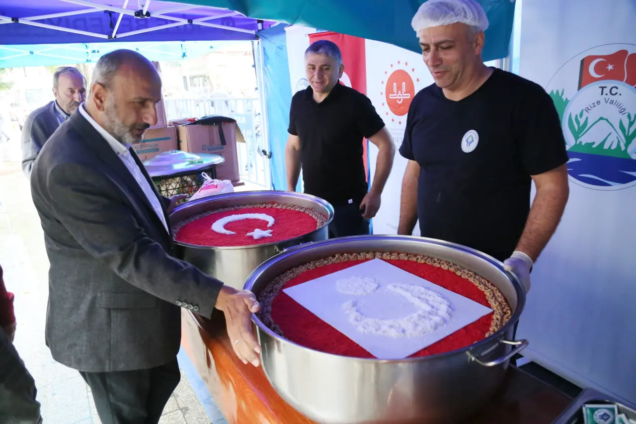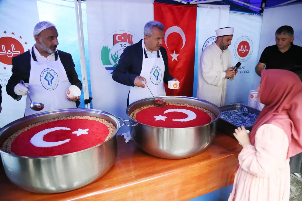 Cuma namazı sonrası gerçekleştirilen programda, binlerce Rizeli bir araya geldi. Etkinliğin dikkat çeken yönlerinden biri ise, ikram edilen aşurelerin üzerindeki ay-yıldızlı Türk bayrağı motifleri oldu. Özenle hazırlanan bu detay, vatandaşların büyük beğenisini kazandı ve birlik mesajı verdi.