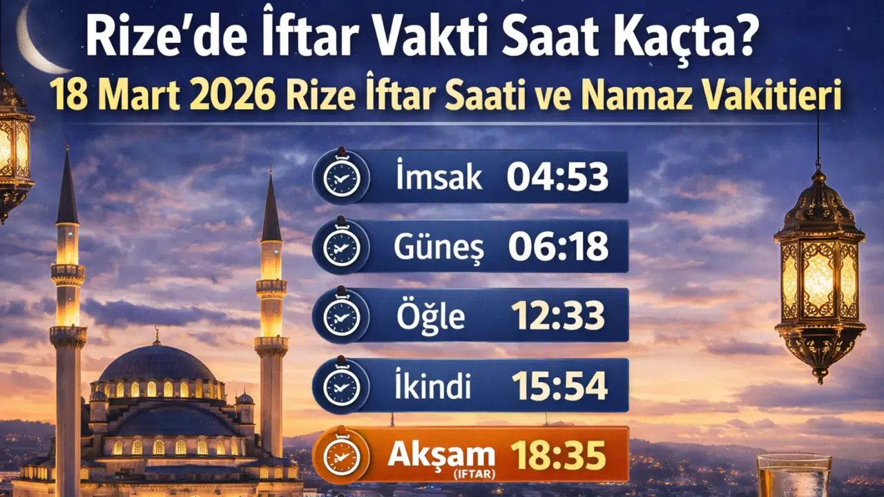 Ramazan ayının devam ettiği bugünlerde Rize’de yaşayan vatandaşlar, 18 Mart 2026 tarihine ait iftar saatini ve namaz vakitlerini merak ediyor. Diyanet verilerine göre Rize’de iftar vakti akşam ezanının okunmasıyla birlikte saat 18:35 olarak açıklandı.
