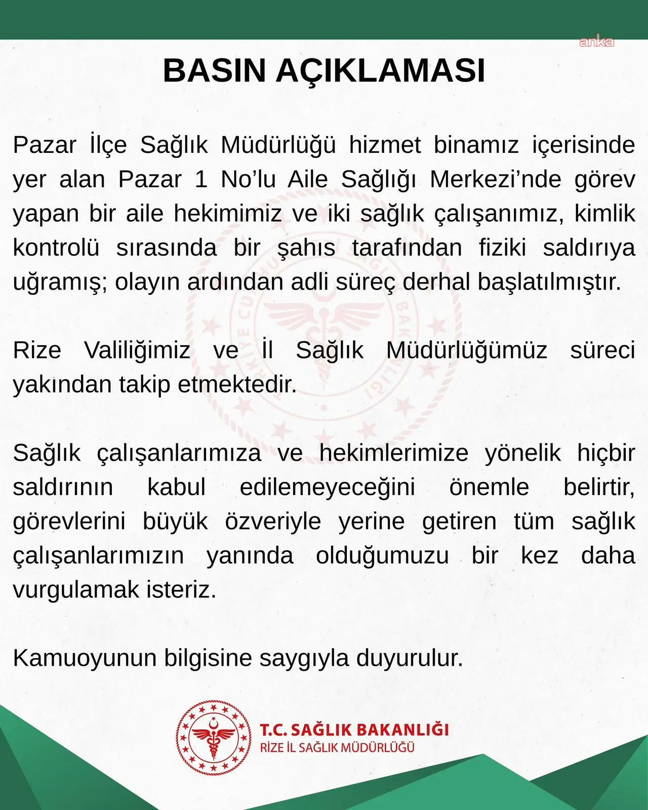 "Pazar ilçe Sağlık Müdürlüğü hizmet binamız içerisinde yer alan Pazar 1 No'lu Aile Sağlığı Merkezinde görev yapan bir aile hekimimiz ve iki sağlık çalışanımız, kimlik kontrolü sırasında bir şahıs tarafından fiziki saldırıya uğramış; olayın ardından adli süreç derhal başlatılmıştır. Rize Valiliğimiz ve il Sağlık Müdürlüğümüz süreci yakından takip etmektedir. Sağlık çalışanlarımıza ve hekimlerimize yönelik hiçbir saldırının kabul edilemeyeceğini önemle belirtir, görevlerini büyük özveriyle yerine getiren tüm sağlık çalışanlarımızın yanında olduğumuzu bir kez daha vurgulamak isteriz."
