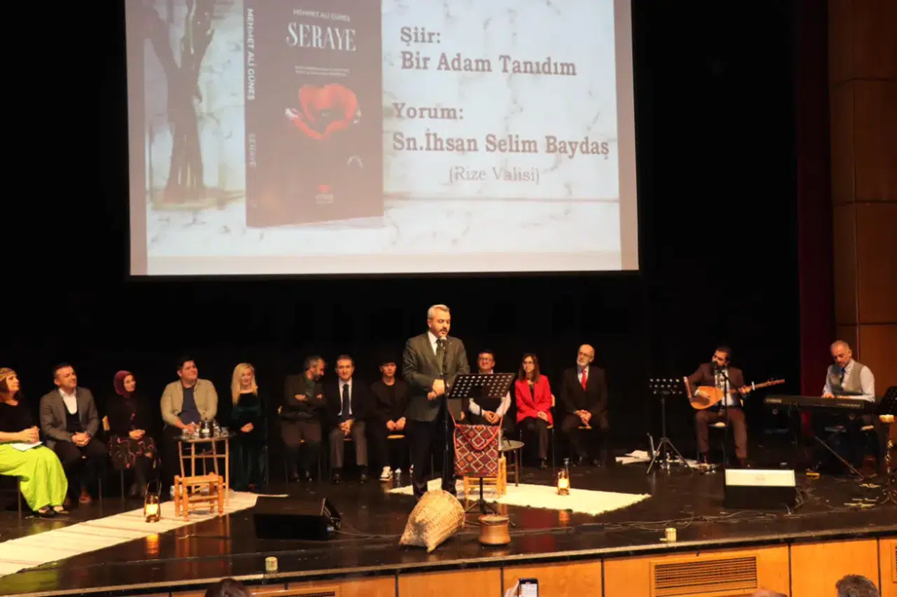 Şair Mehmet Ali Güneş’in ‘SERAYE’ isimli şiir kitabından harmanlanan şiirlerinin türküler eşliğinde seslendirildiği gecede Rize Valisi İhsan Selim Baydaş ve Rize Belediyesi Başkanı Rahmi Metin’inde ses ve yorumlarıyla renk kattığı şiir yüklü gecede; Milli Eğitim Müdürü Yusuf Tüfekçi, Düzce İl Kültür ve Turizm Müdürü Esra Alemdaroğlu, İl Özel İdaresi Genel Sekreteri Ümit Hüseyin Sarı, Beyaz Karanfil Derneği Yönetim Kurulu Başkanı Birsen Ertan, Şair Mehmet Ali Güneş, Şeyma Kan, Muhammet Gençbay, Cevher Sukas, Neslihan Özçelik, Erdoğan Muradoğlu, Ahmet Topal, Nedim Turanlı ve Oğuzhan Bektaşoğlu'nun yorumları ile şiir ve müzik severler unutulmaz ve sanat dolu bir gece geçirdiler.