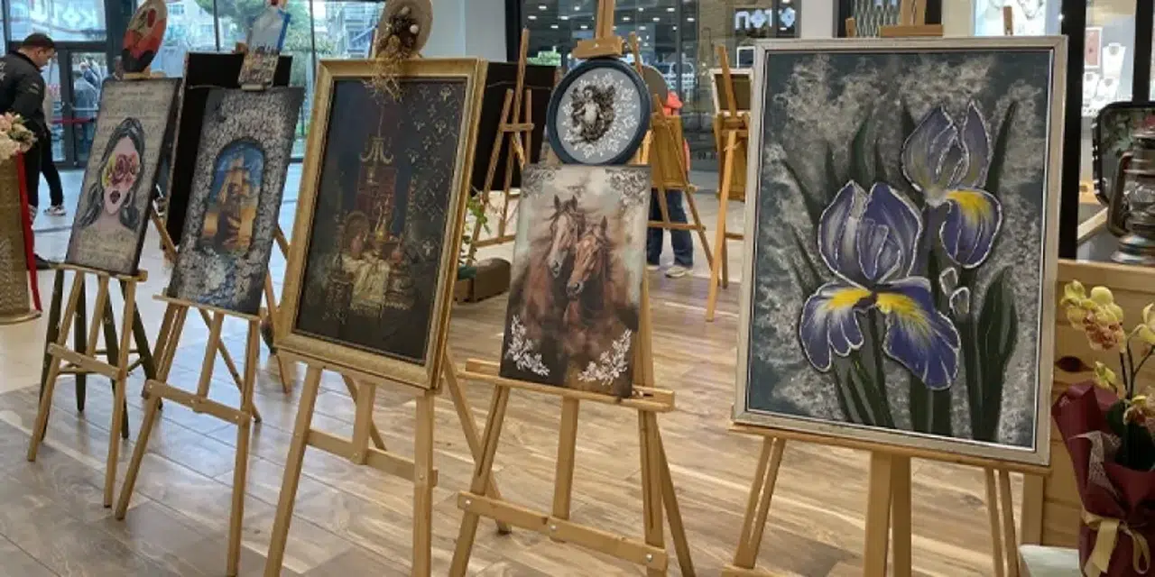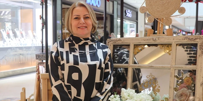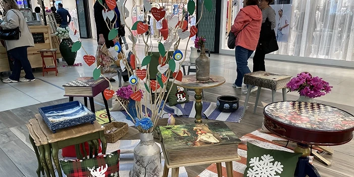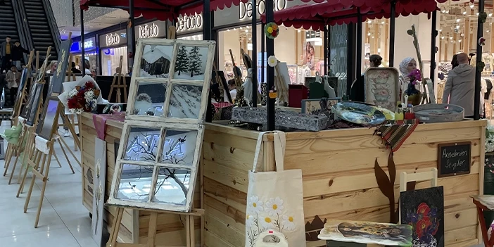 Kentteki bir alışveriş merkezinde, "Anneler Günü" kapsamında açılışı yapılan sergide, asırlık bir eve ait pencereden dönüştürülen tablolar, eski güğümlerden oluşturulan eserler, tepsiler, sehpalar, işleme yapılmış yastıklar, bez çantalar, kitap ayraçları, boyama yapılmış tabaklar yer alıyor.